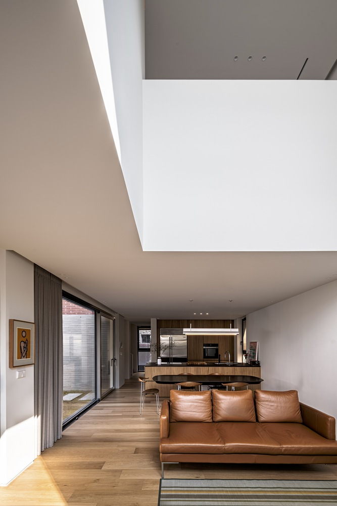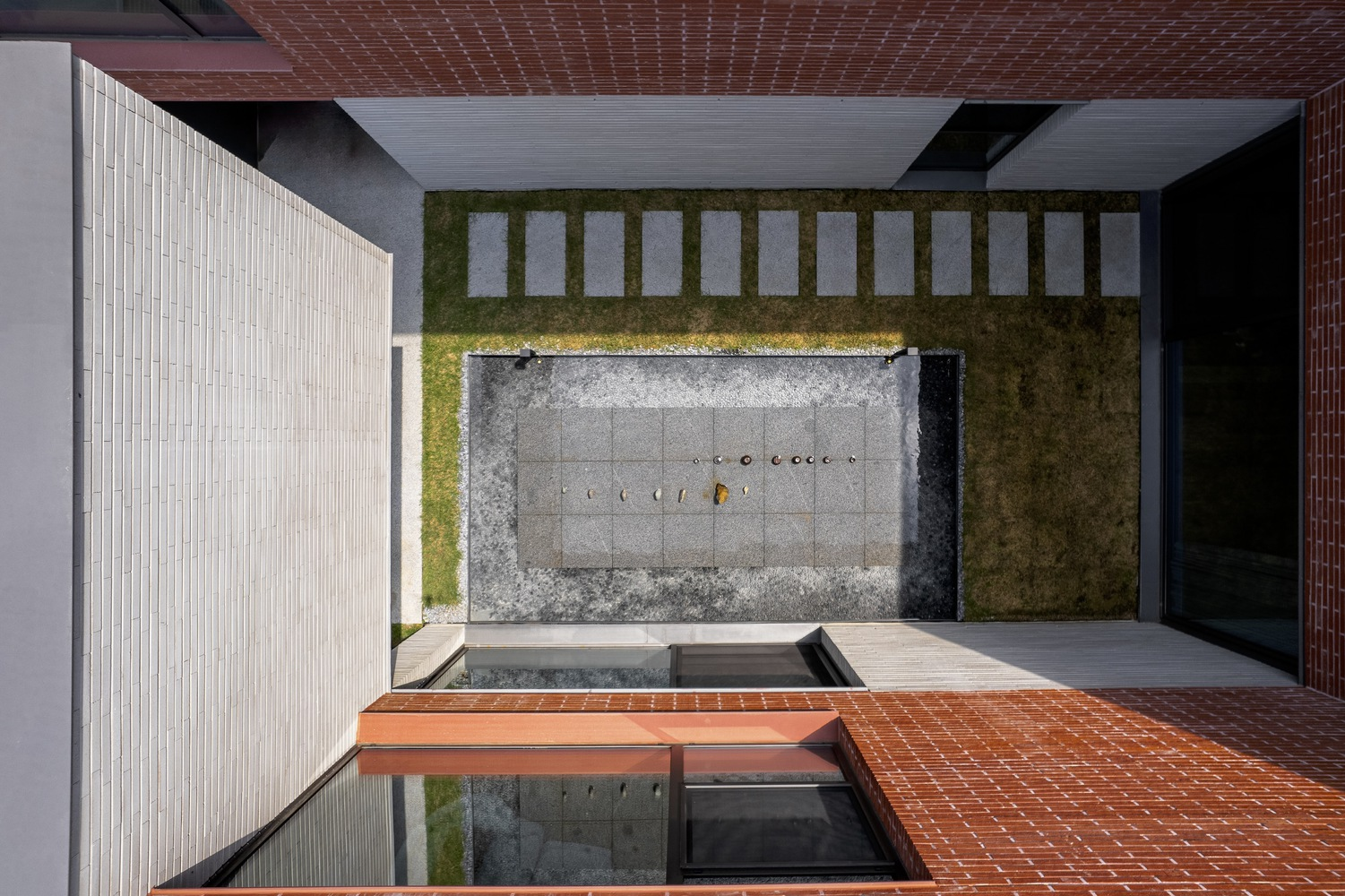 Central to the residence's design is the innovative use of water in the courtyard, introducing an additional layer of privacy and openness. The water feature reflects the sky and surrounding architecture, creating a sense of expansiveness and tranquility. This design choice not only enhances the aesthetic appeal of the courtyard but also serves as a dynamic element that adapts to the residents' needs, offering versatility in its use.
