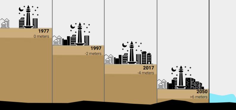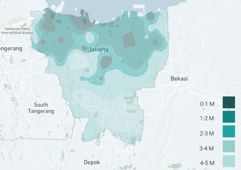 The northern part of Jakarta is plain land, some areas of which are below sea level and subject to frequent flooding. They are falling at an estimated 25 cm a year. This is majorly attributed to land subsidence from the over-extraction of groundwater and Climate Change.