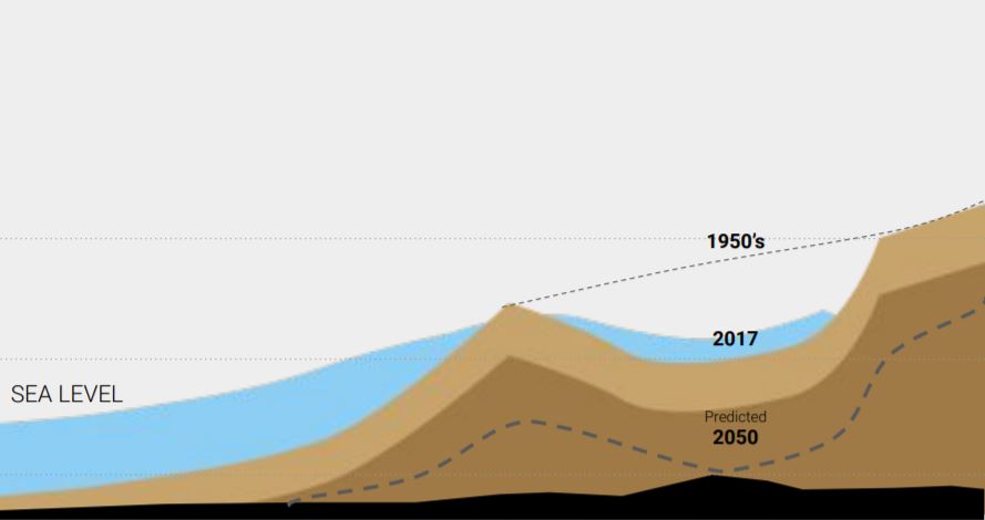 Over the years, the land has sunk more than 4 m and is predicted to sink even more. The sunken land accumulates water during heavy rainfall or when water level rises. This evenually brings a part of land under water, submerging it completely. The increasing density of population on land makes the situation even more adverse. The challenge here is to accept the adversities that have alreay occured and prepare for a reslient future.