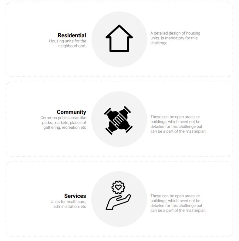 The programme of the Flood Resilient Neighbourhood has been broadly categorized into the above based on typology of the structure. However, the participants are free to add other programmatic facilities depending on their design. The number of floors for each housing unit is dependent on design and structural strength. Additionally, apart from the residential facilities, the rest of the provisions only need to be earmarked/designated on the masterplan and not detailed.