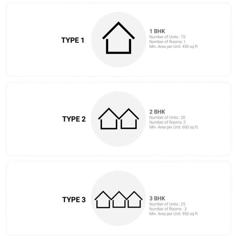 The typology of residences in Flood Resilient Neighbourhood has been broadly categorized into the above based on usual structure of families. (The participants are free to add the required number of washrooms, kitchen, balcony, etc areas, according to their design idea)