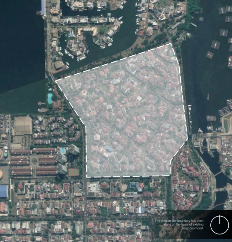 The site selected for this project is a part of the northern coast an an existing neighborhood area in the Jl pantai Mutiara district which is predicted to be partly submerged by 2050 due to land sinking and rising sea levels. For the purpose of this challenge the plot must be considere vacant / already submerged and a prototype zone for development.