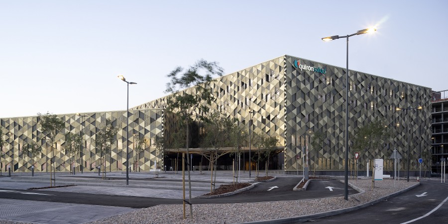 Parametric perforated façade mediating light, privacy, and urban context - Córdoba Quirónsalud Hospital by ENERO ARCHITECTS