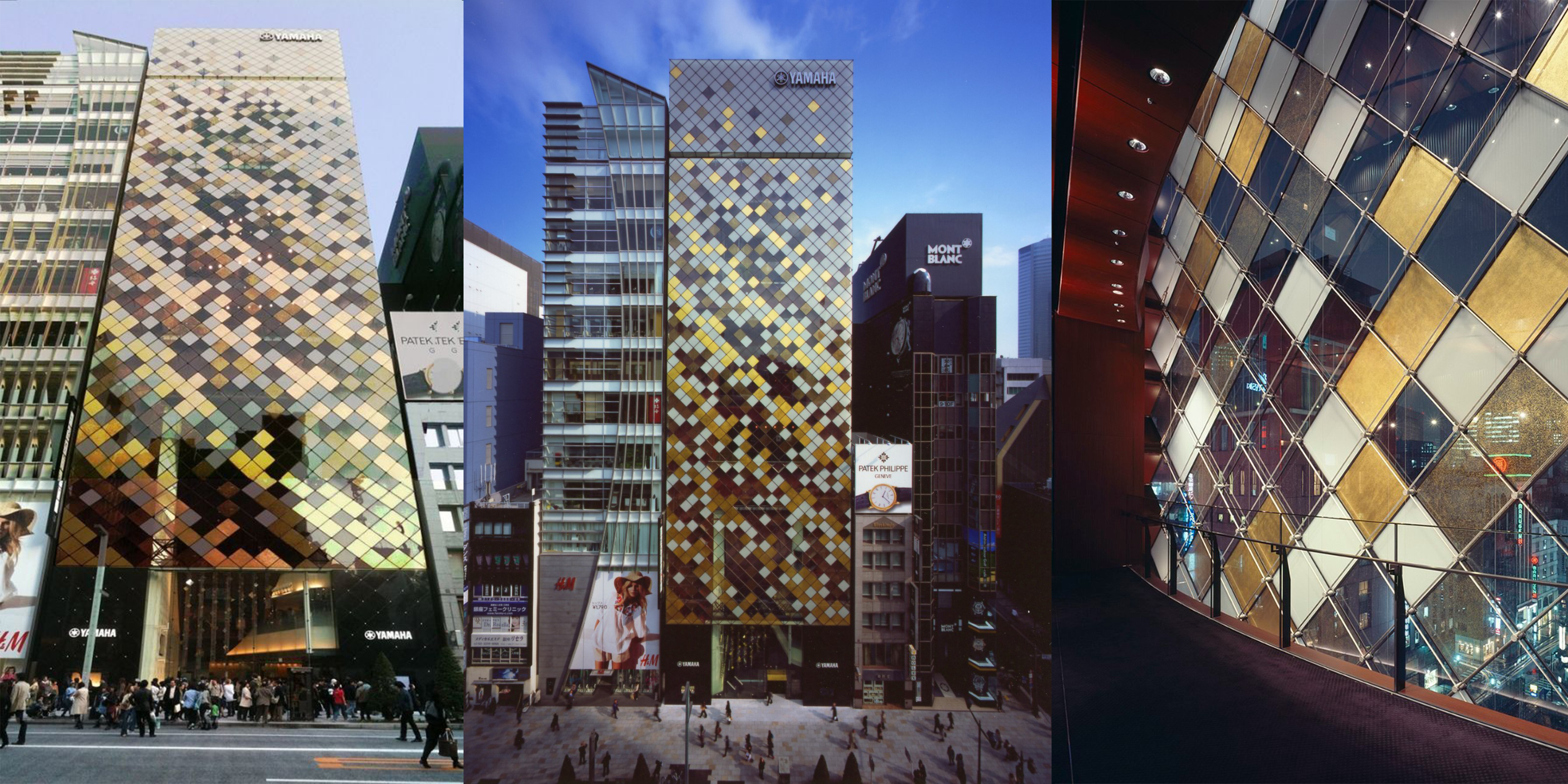 Modular diamond façade articulating light, reflection, and depth - Yamaha Ginza Building by NIKKEN SEKKEI