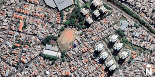 The site is on the Campo Tirandentes soccer field. It is in the neighbourhood of Vila Dionisia, surrounded by educational institutes. The area is enriched by active nightlife, lively art murals, street food and so on, attracting a lot of traffic. The field has loose fencing around it and the corner marked can be used to build this clubhouse for easy viewing.