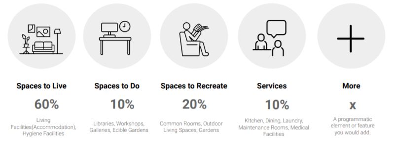 A programmatic outline intended to house 4000 elderly is recommended for this challenge. However the submission asks for design to be considered in 4 phases of a 1000 each. Participants are recommended to craft a schematic programme based on these given segments or they can propose something new altogether.