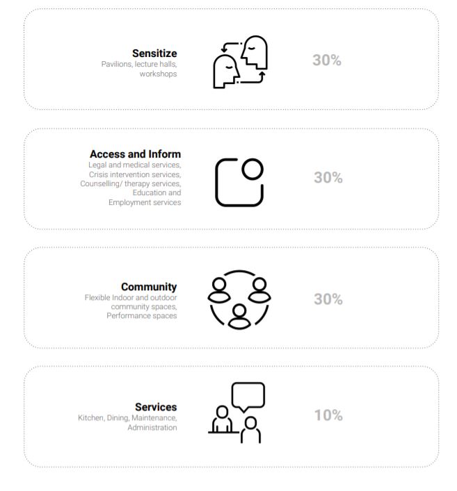 A programmatic outline intended to host about 75 people at immediate expanse with a floating population of about 120/150 people is recommended for this challenge. Participants are recommended to craft a schematic programme based on these given segments or they can propose something new altogether.
