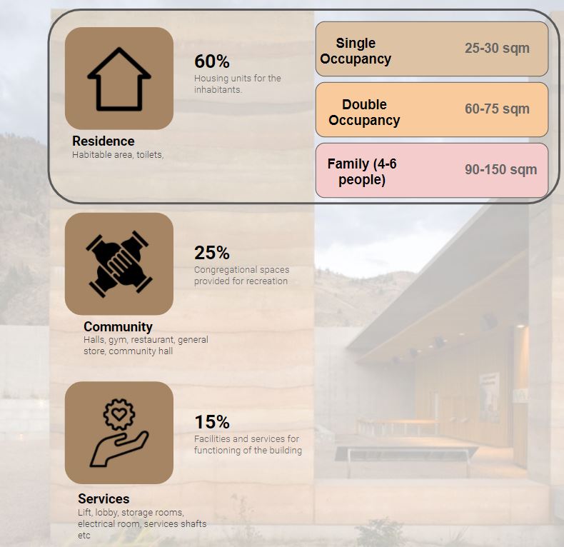 Given guidelines are outlined for the ease of designing. Participants are encouraged to add new functions according to their design requirements. The housing units will be based on the given carpet areas. The ratio of the single, double aqnd family units are flexible and are to be decided as per the design requirements.