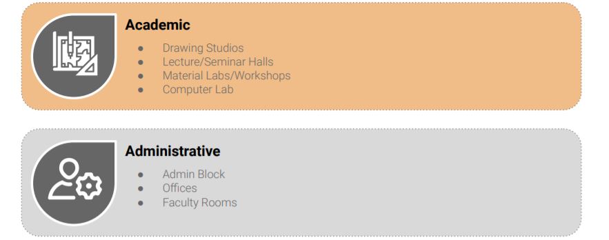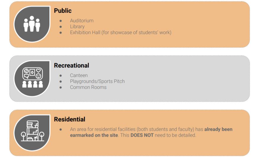The above serve as qualitative checkmarks for the design of the institute. Participants can assume a mixed demographic for designing services and provisions etc in the institute. Participants are even free to draw from their own study experiences, incorporating what they thought was lacking from their institute of study, especially given the comprehensive needs of Architecture students. The space programme, however, will be derived from the information given ahead.