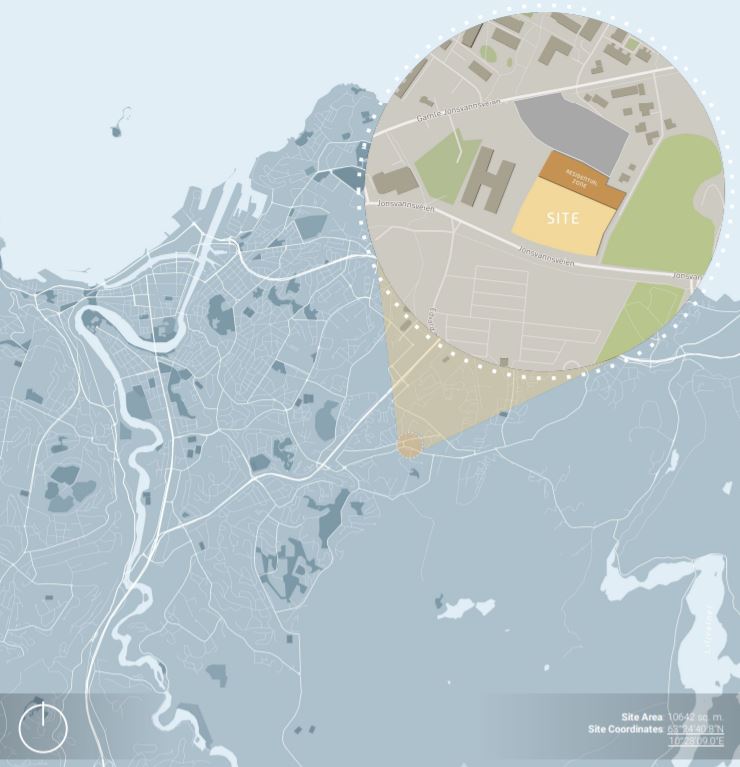 The site is located in Nordre Hegdalen in Trondheim, and lies adjacent to the Dragvoll health and welfare center, surrounded by dense green patches. The settlement around is part residential, part institutional, but mostly agricultural. The geographic location of the site is offset from the main city centre in favour of a more quaint environ.