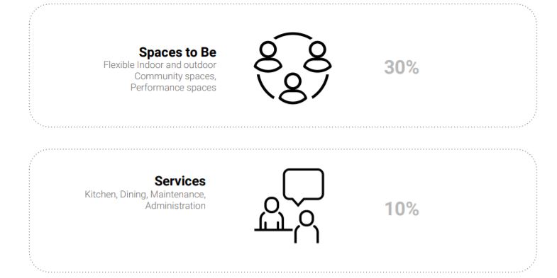 A programmatic outline intended to host about 75 people at immediate expanse with a floating population of about 120/150 people is recommended for this challenge. Participants are recommended to craft a schematic programme based on these given segments or they can propose something new altogether.