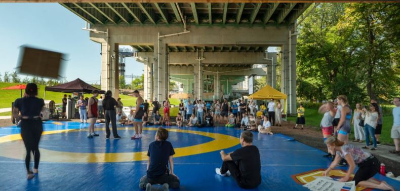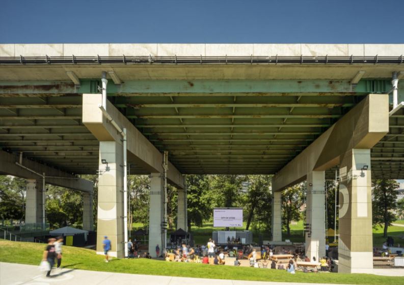 Img 3: Image illustrative of an example of the underside of an expressway re- imagined to be a community space. Source