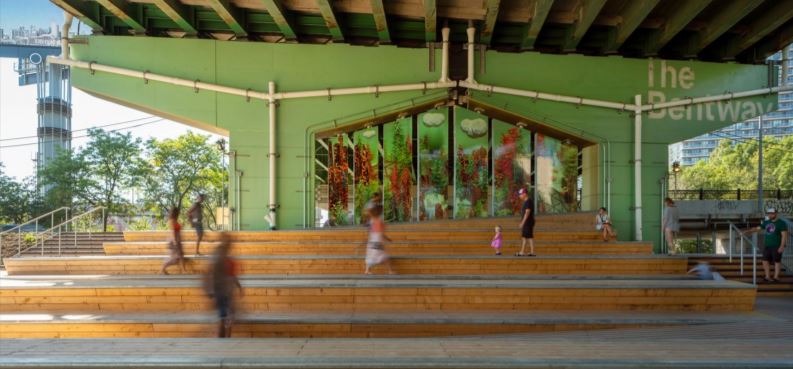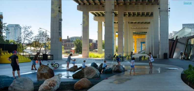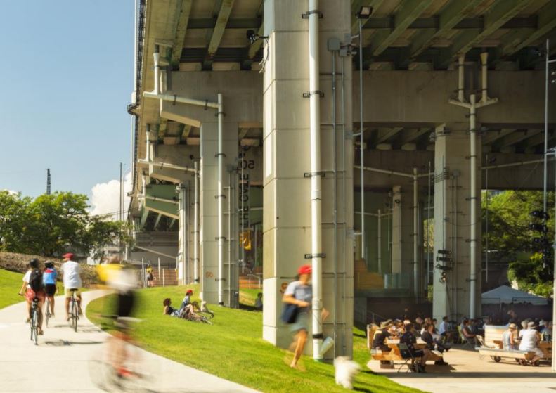 Img 4: Image illustrative of an example of the underside of an expressway re- imagined to be a community space. Source