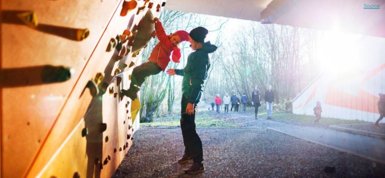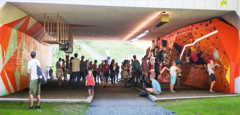 Once a 30 - meter long disused railway underpass, it has been re- imagined into a lively play space, with its own climbing wall, monkey bar and a creative exercise area.