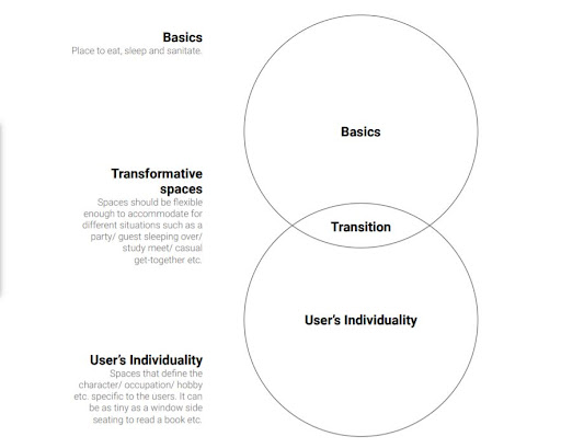 Focus should be given to the transforming nature of the spaces proposed. The space should be flexible enough to accommodate different scenarios such as a guest staying over or a house party or group study or exercising etc. (depending on the character sketch of the users).