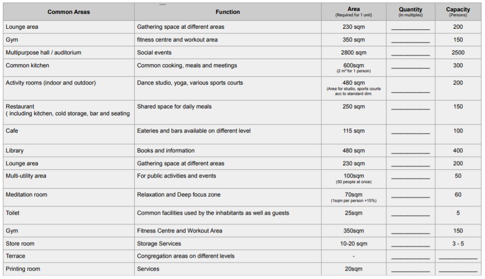 Participants can fill their own data in given blanks. The above data is free for modification, if the design demands so. Different functions can be clubbed together, added or deleted if required. For any other information refer urban development guidelines of Singapore.