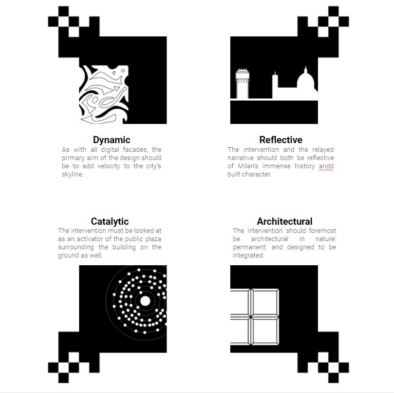 The challenge is to design a digital façade on the given building (The Torra Velasca, Milan, Italy) to act as an activator, for itself and the immediate surrounding, and to add an additional layer of dynamism and post operation-hours utility to the building.