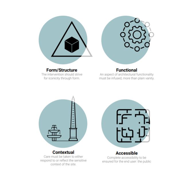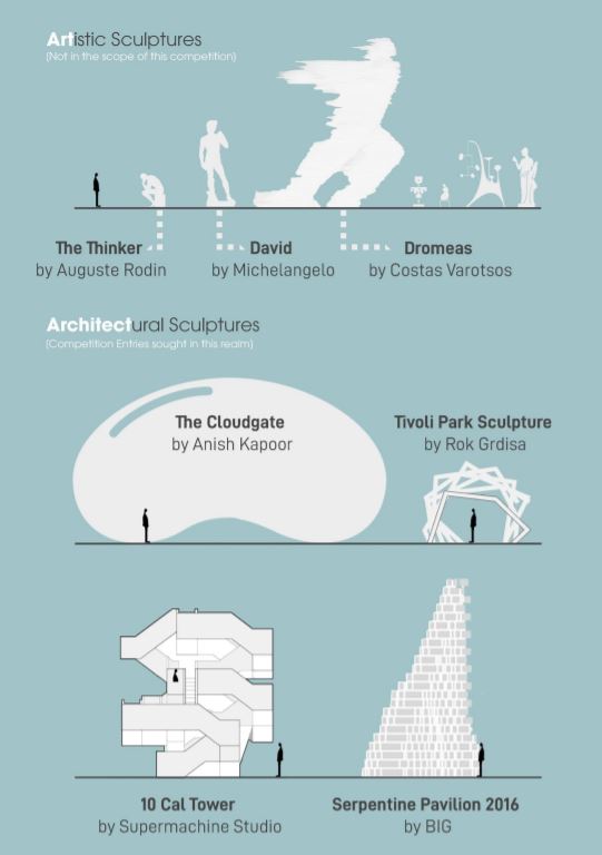 The inforgraphic attempts to further differentiate between the kind of intervention required by this competition (architectural), and architecture sculptures. When closely examined, it can be seen that the distinction between the two, though narrow, can be found in terms of scale, mobility of the user, utility, and material, but primarily, the method of inception, its construction and the purpose it serves in the public realm.