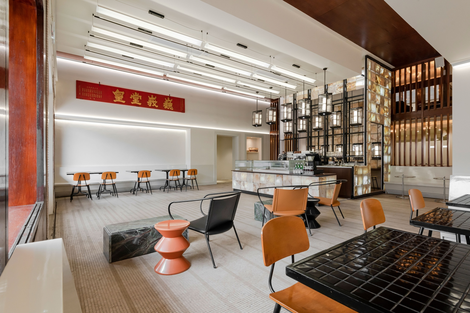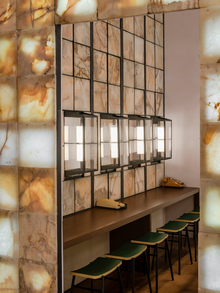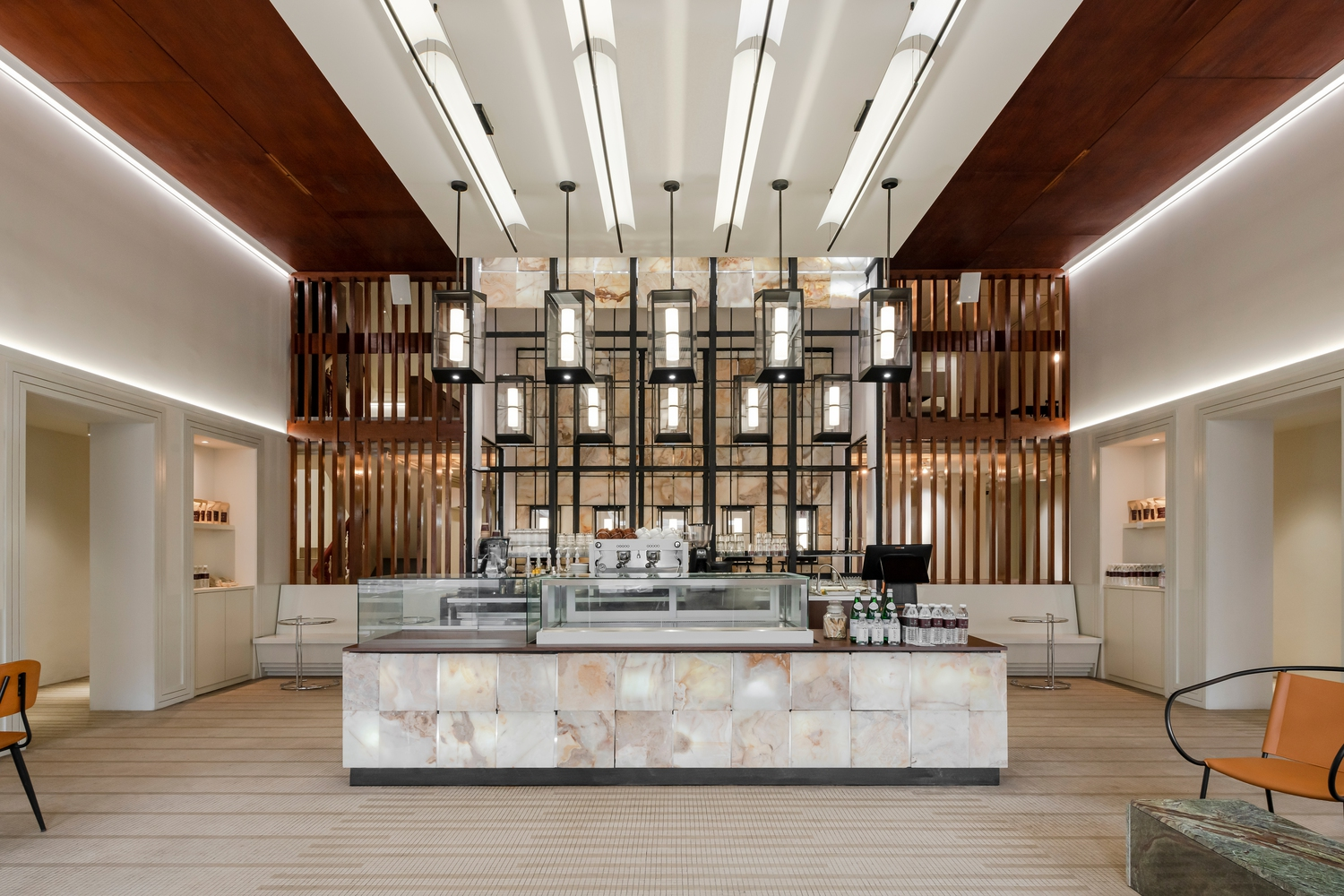 In addition to the onyx coffee bar, the café's lighting design plays an essential role in bridging the past and present. Pendant lights, inspired by the building’s prismatic windows, add a modern touch, while antique gas streetlights pay tribute to the building’s past. The careful integration of contemporary design elements with historical features illustrates how adaptive reuse can create a harmonious balance between the old and new.