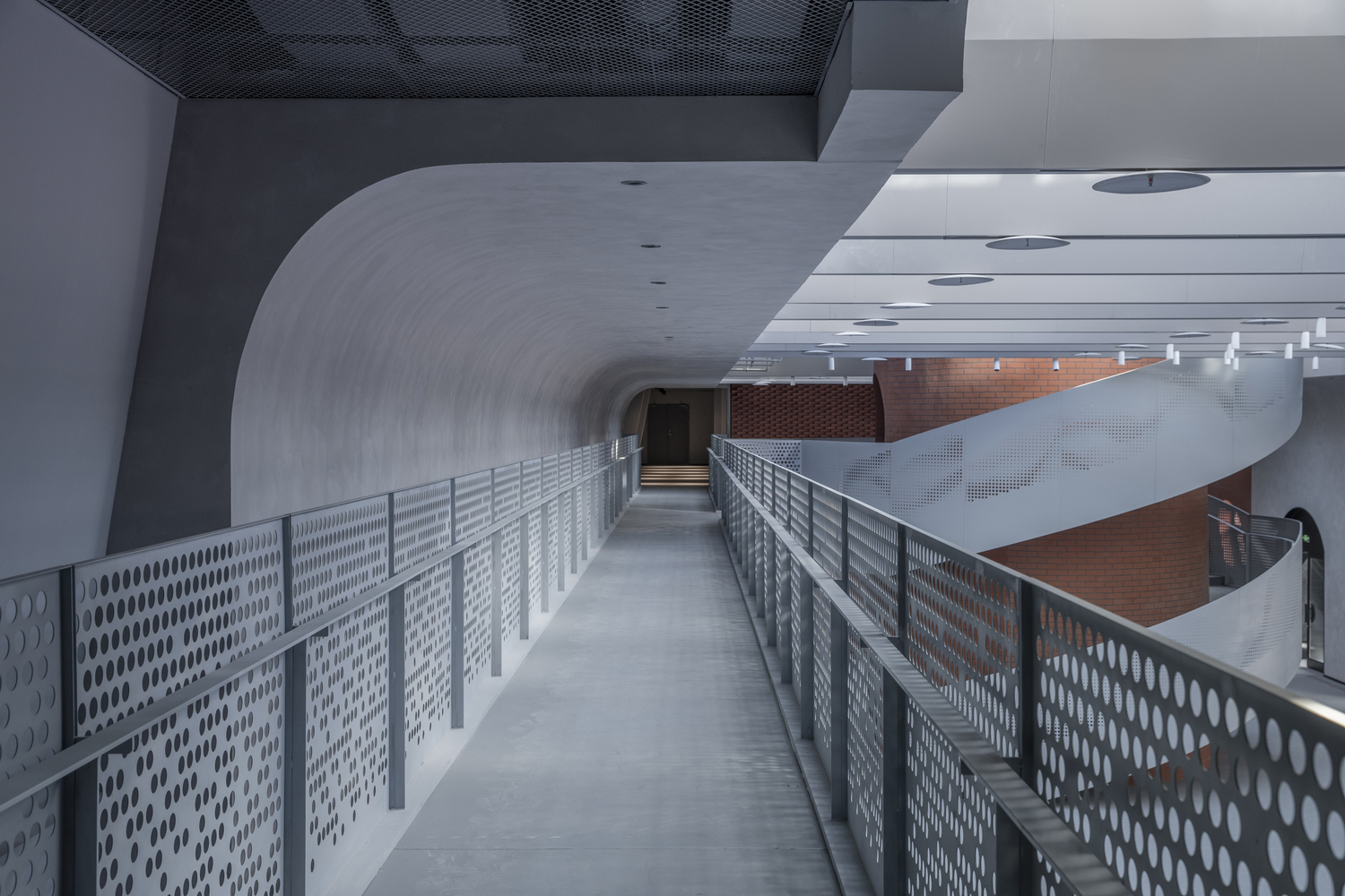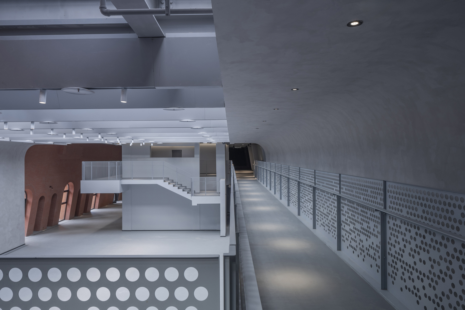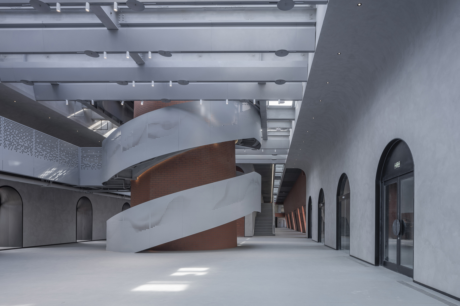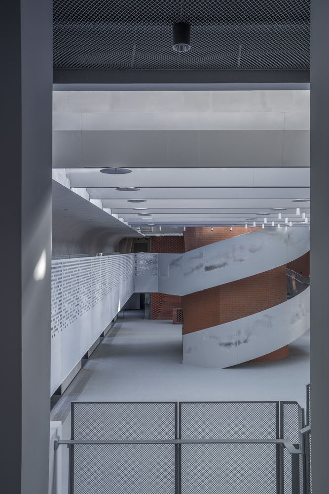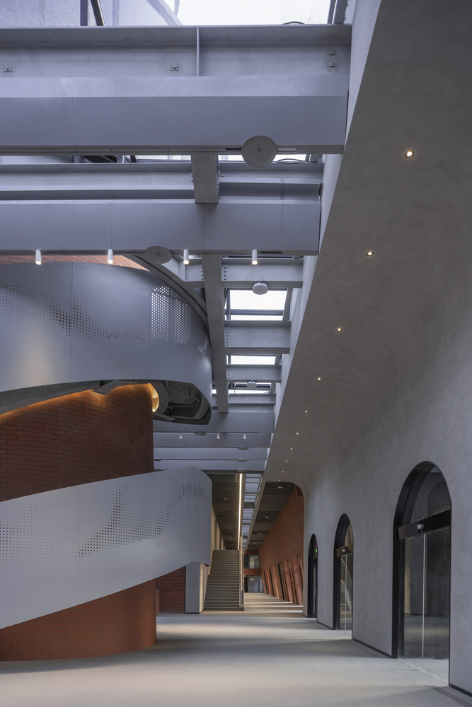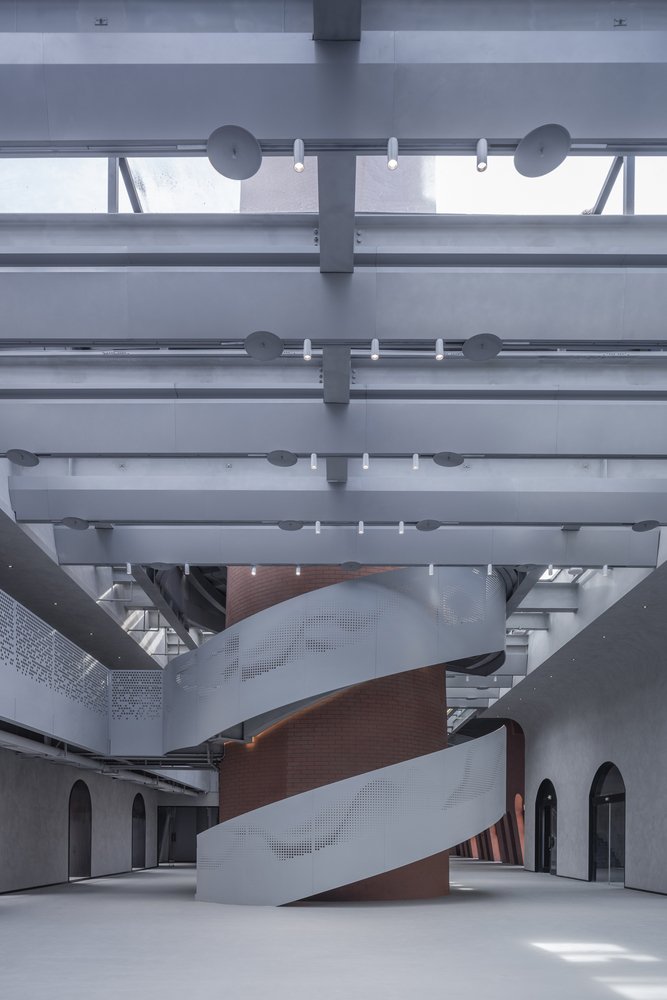 At the heart of Brickkiln Lane lies the Chimney Hall, crowned with a transparent glass roof supported by long-span steel beams. This central space is designed to host public gatherings and exhibitions, illuminated by natural light that filters through an innovative V-shaped aluminum plate ceiling.