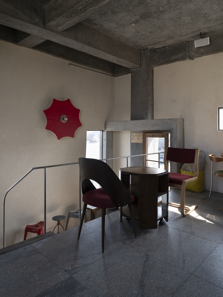The ice-cutting room’s original lifting platforms were creatively repurposed. One platform was lowered to create a sunken seating area on the ground floor, while the other was elevated to the second floor, functioning as a small exhibition space that highlights local art and fishing culture.