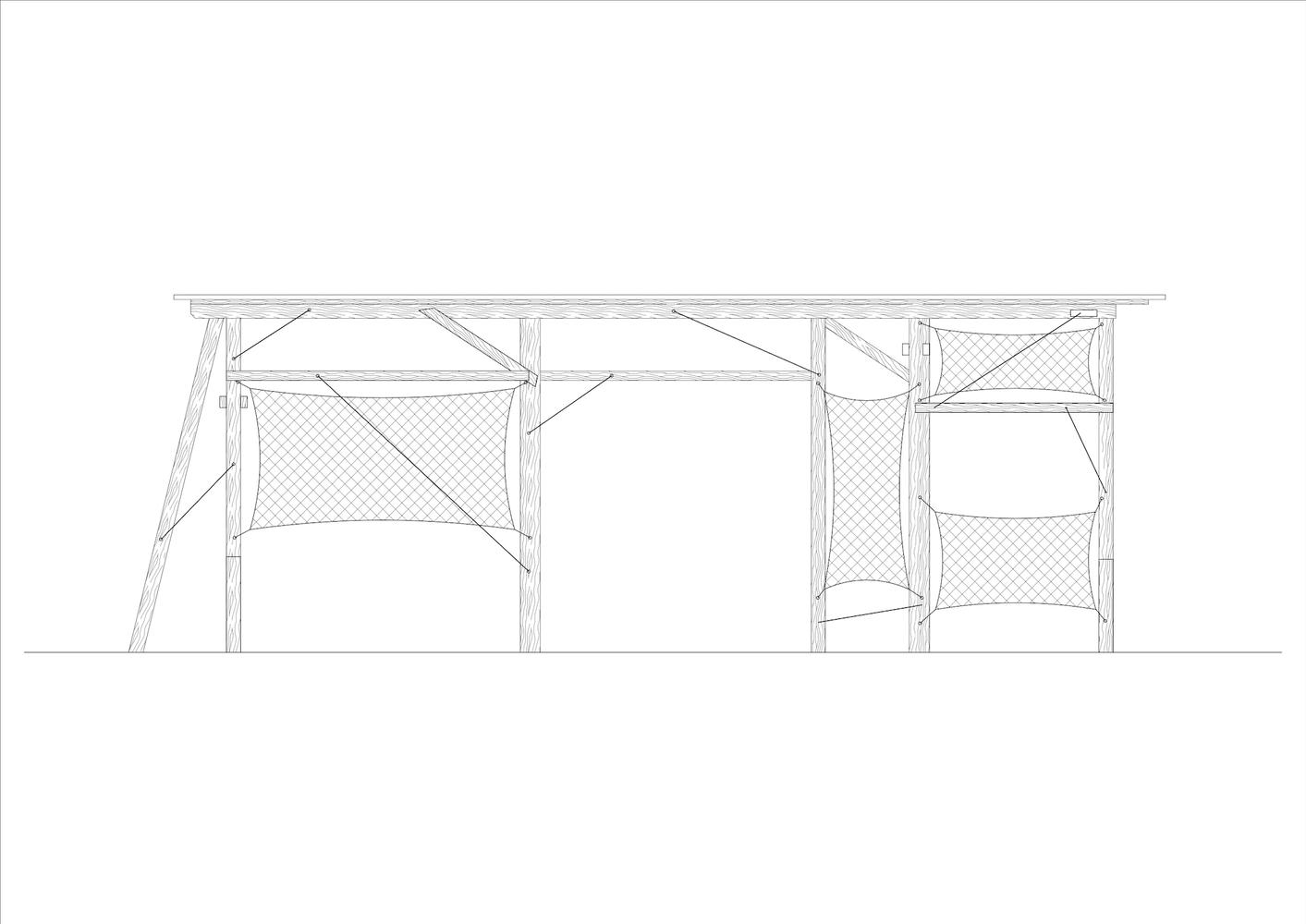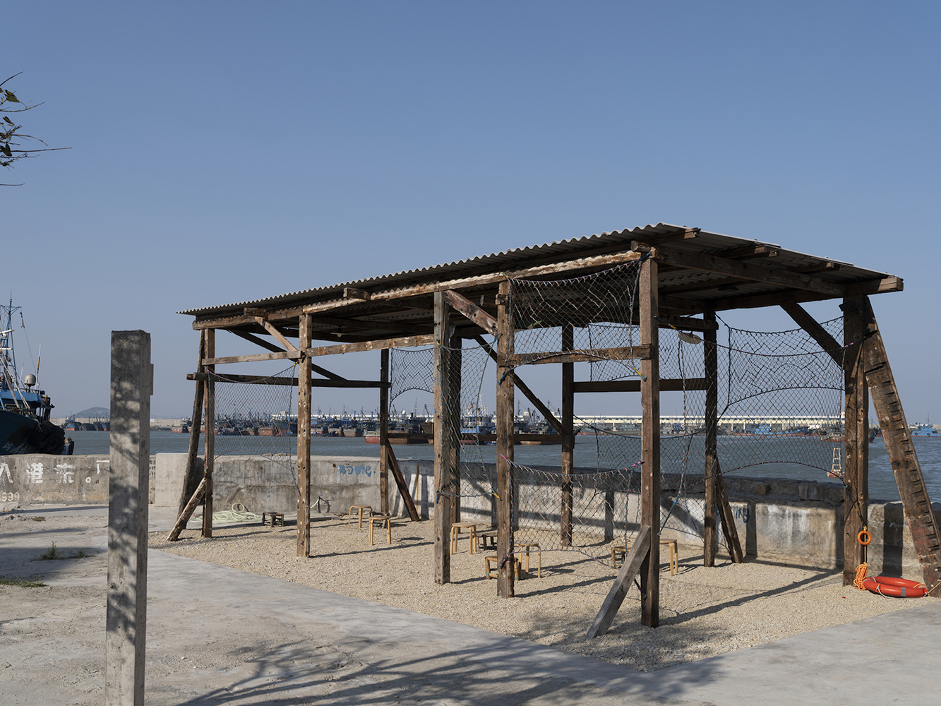 Adjacent to the two small buildings, the skeleton of a decommissioned ship has been repurposed into a shed structure. This space, shaded by colorful fishing nets woven by local fishermen, serves as a shared area for various activities. It welcomes winter swimmers, fishermen, rescue workers, and coffee enthusiasts, fostering a sense of community and interaction. The interplay of sunlight and fishing nets creates a dynamic and vibrant environment, celebrating the artistry and craftsmanship of the local community.