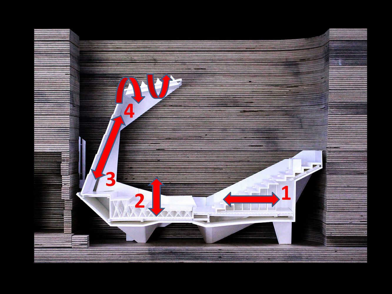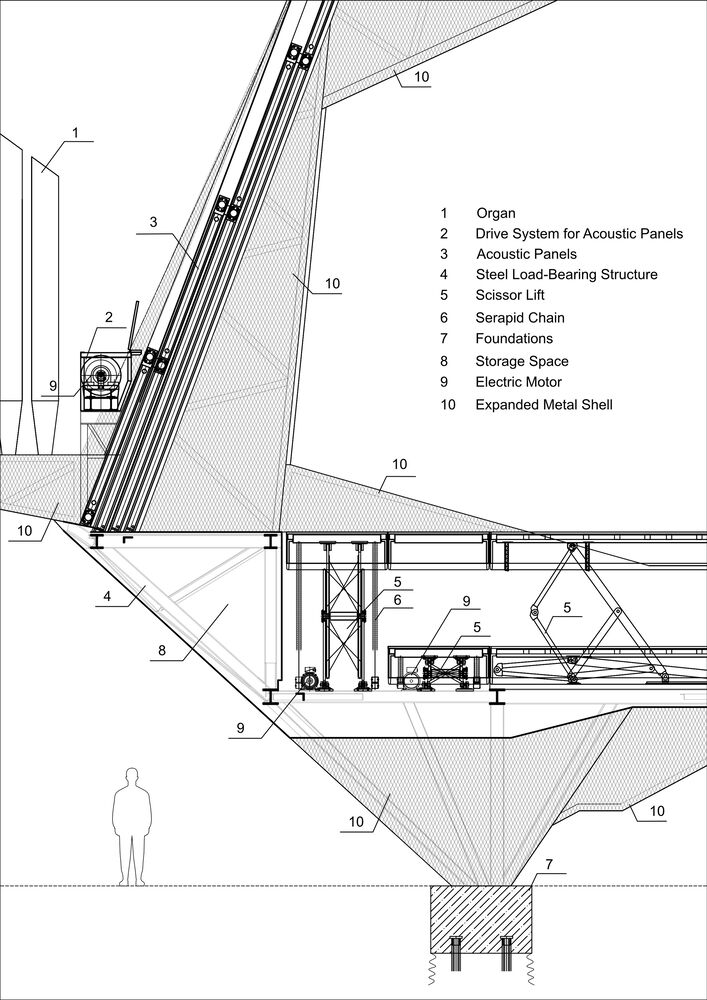 Rotating triangular panels above the stage allow sound to be reflected, absorbed, or dispersed based on the event’s needs. A retractable screen serves as an orchestral shell, optimizing sound projection toward the audience. The stage floor incorporates wooden panels mounted on a steel structure, functioning as acoustic resonators that harmonize with the orchestra’s instruments.