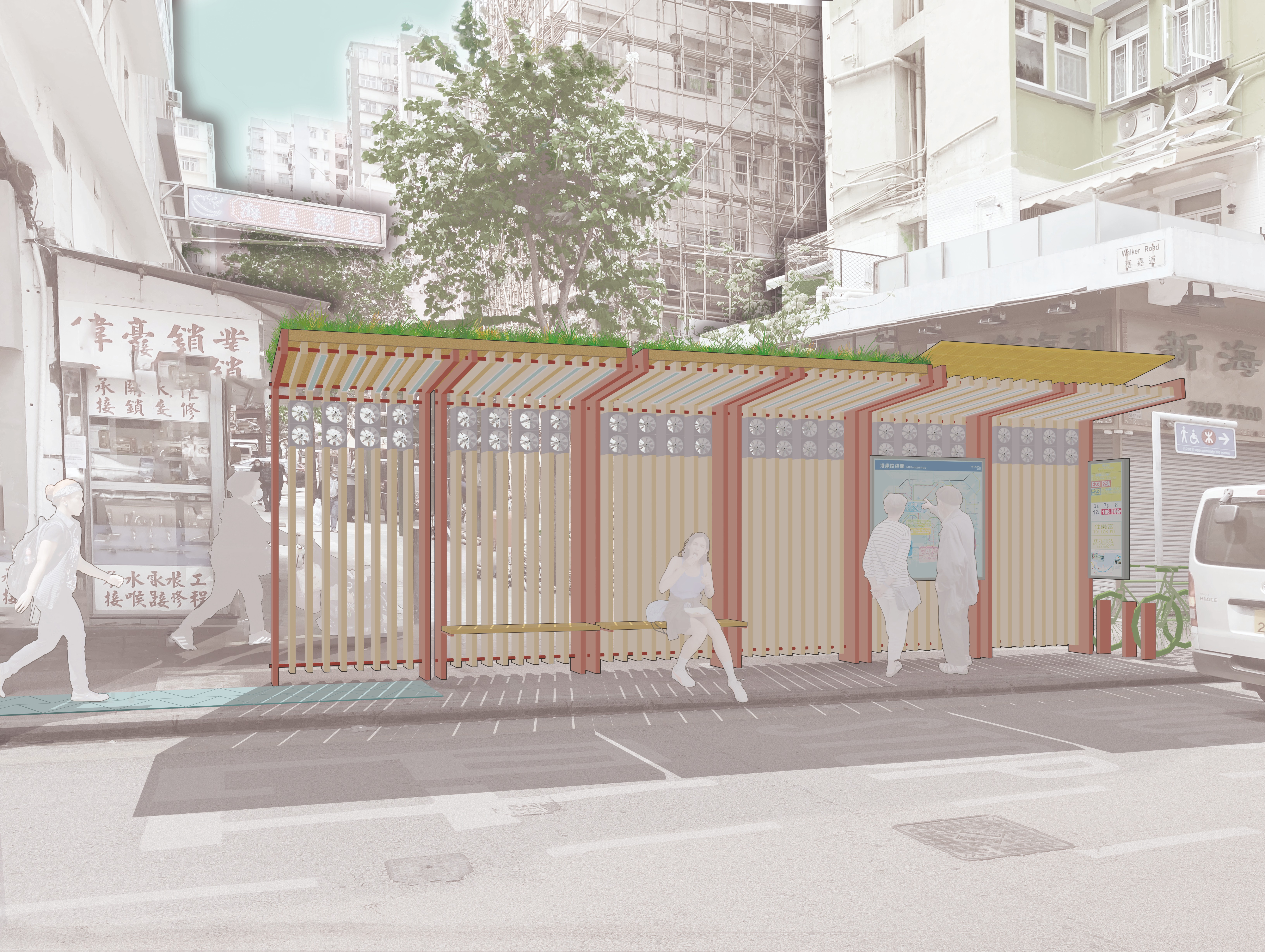 Description: Bus is an essential means of public transport in Hong Kong. This project combines a fading aesthetic element and the cantilevered nature of buildings in the urban fabric to improve the lack of visibility and functionality of bus stops in urban districts.