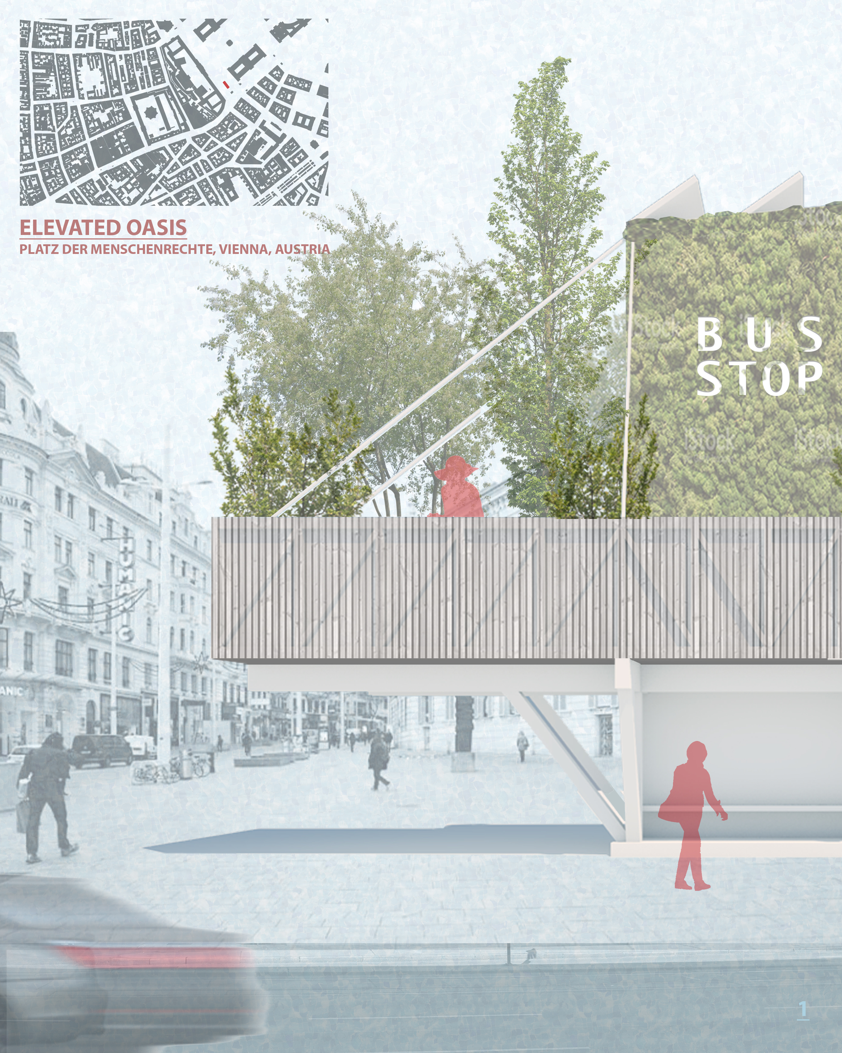 Description: The concept of this better bus stop is to add extra public space in an eco-friendly way. The elevated oasis functions by adding an extra layer of soil above the CLT slab which enables plants to grow.