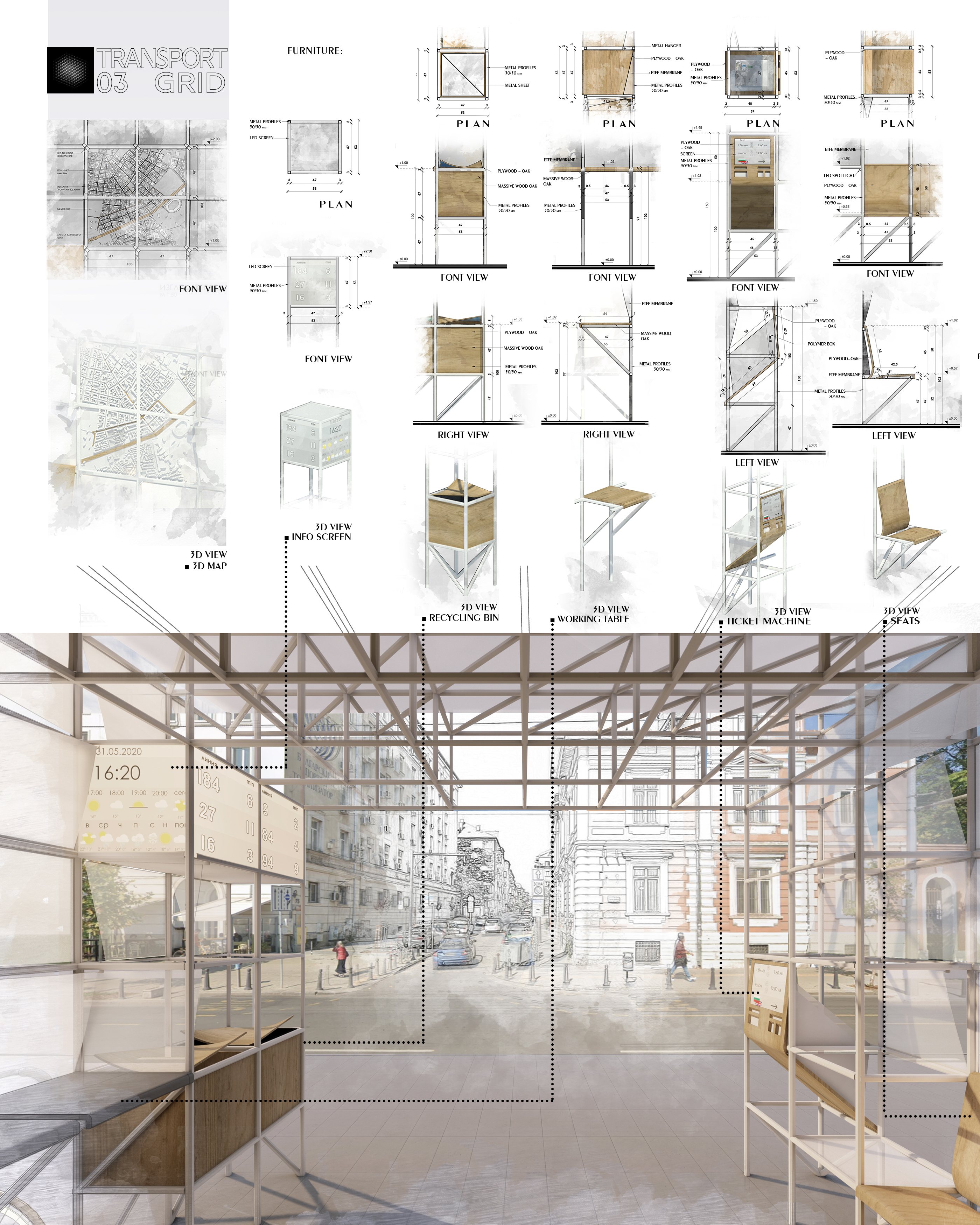 Description: Transport grid is a modular system for bus stops that aims to fit in the environment by using light, aerial, see-through materials. Reminding more of an art installation, the structure inspires and provokes the imagination of every citizen.
