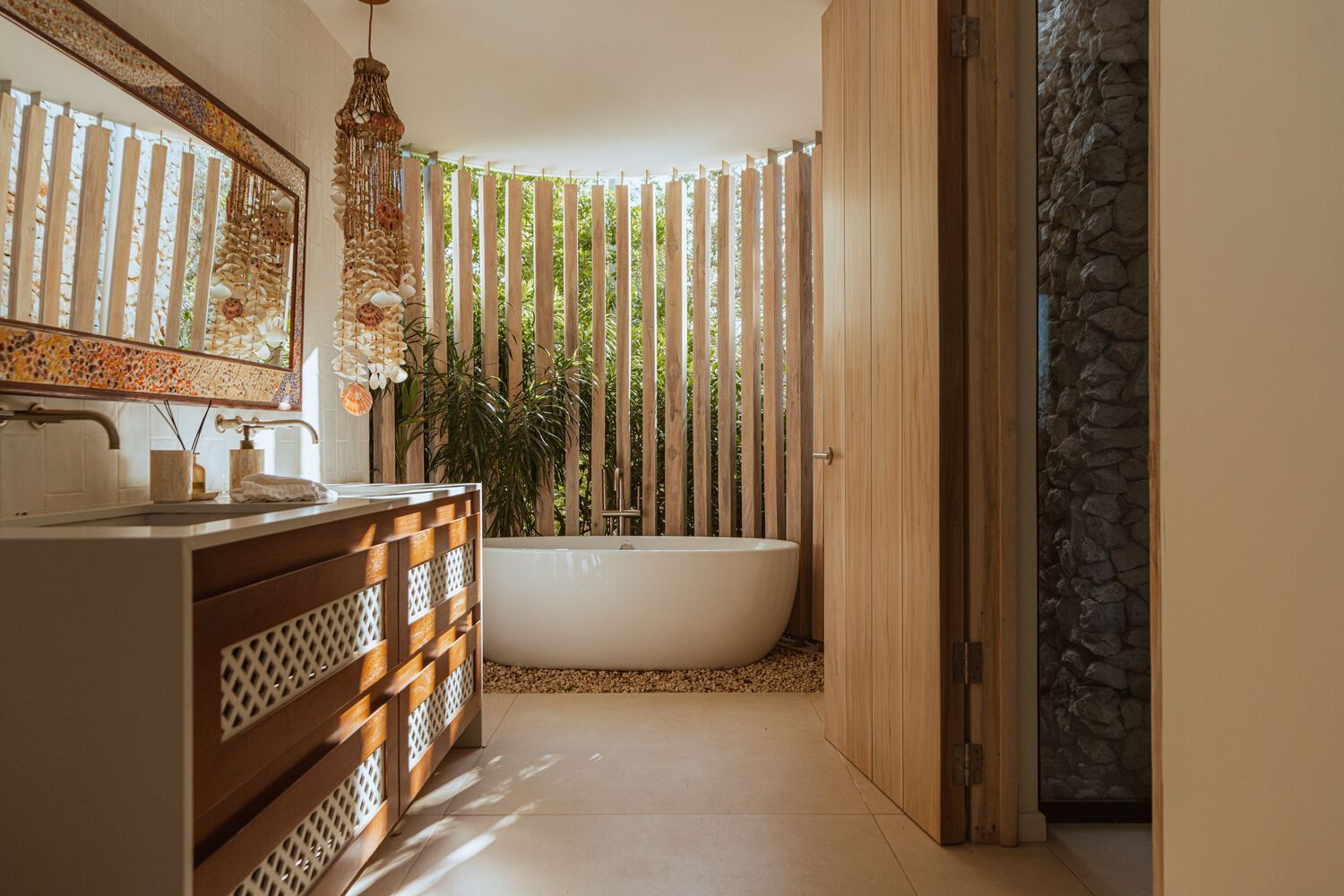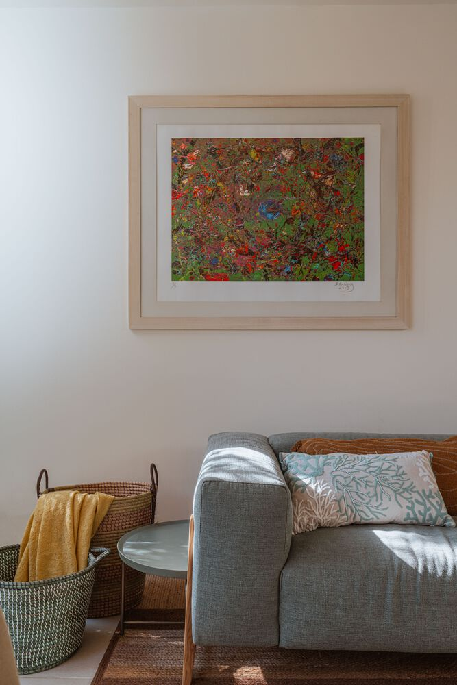 Incorporating biophilic principles, the home’s lighting design enhances its organic ambiance. Custom fixtures, handmade by local artisans, introduce a sense of artistry to the bathrooms and common areas. Unique mosaic installations, created in collaboration with local artists, further personalize the space, reflecting the homeowners’ individuality and cultural heritage.