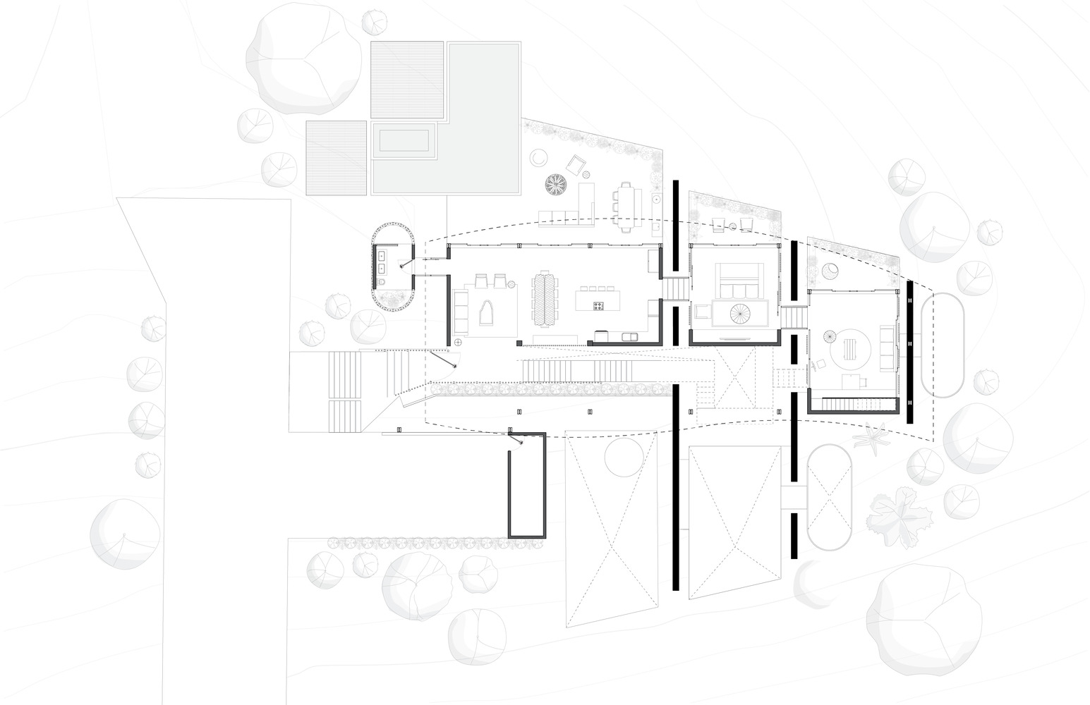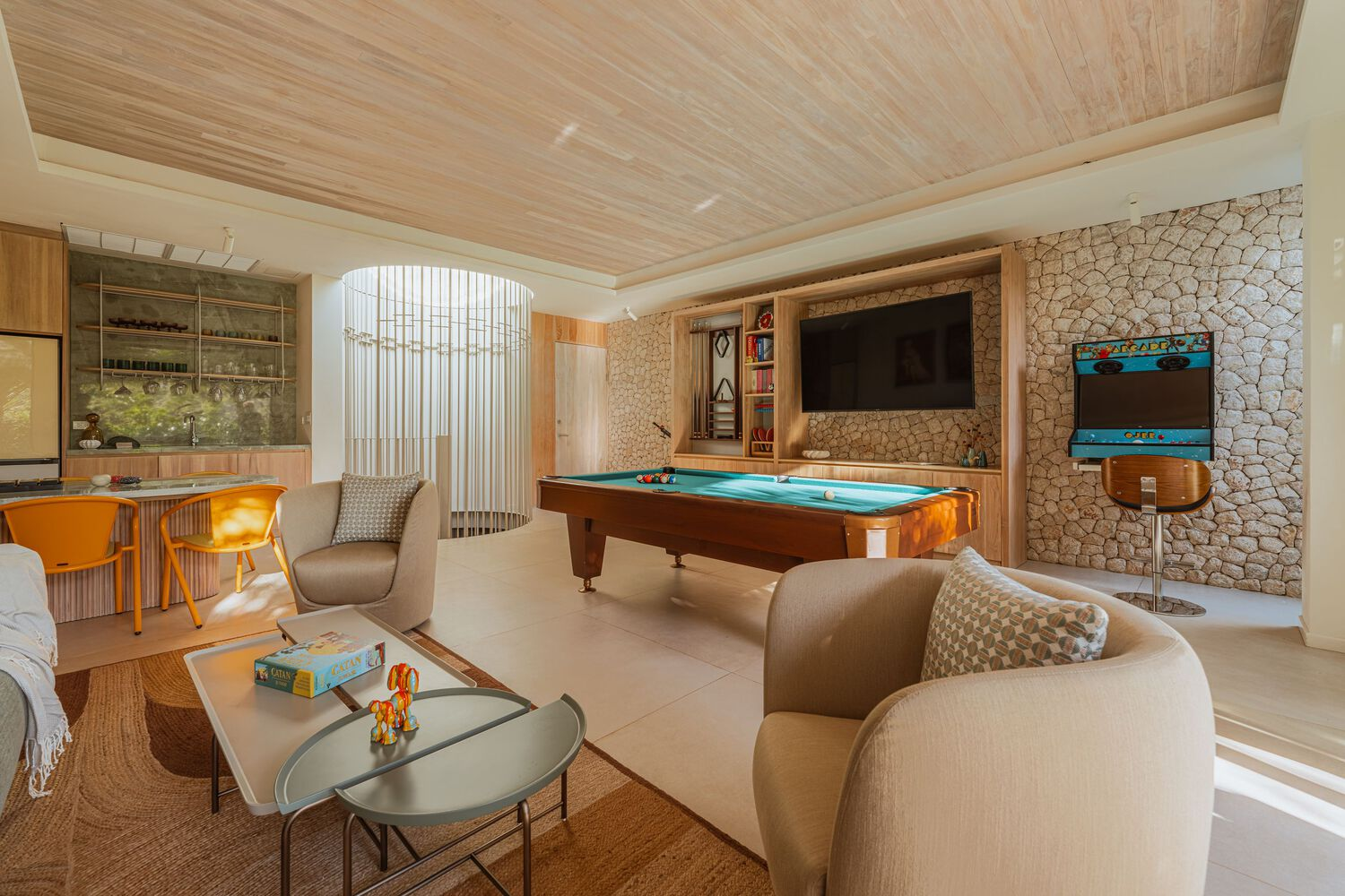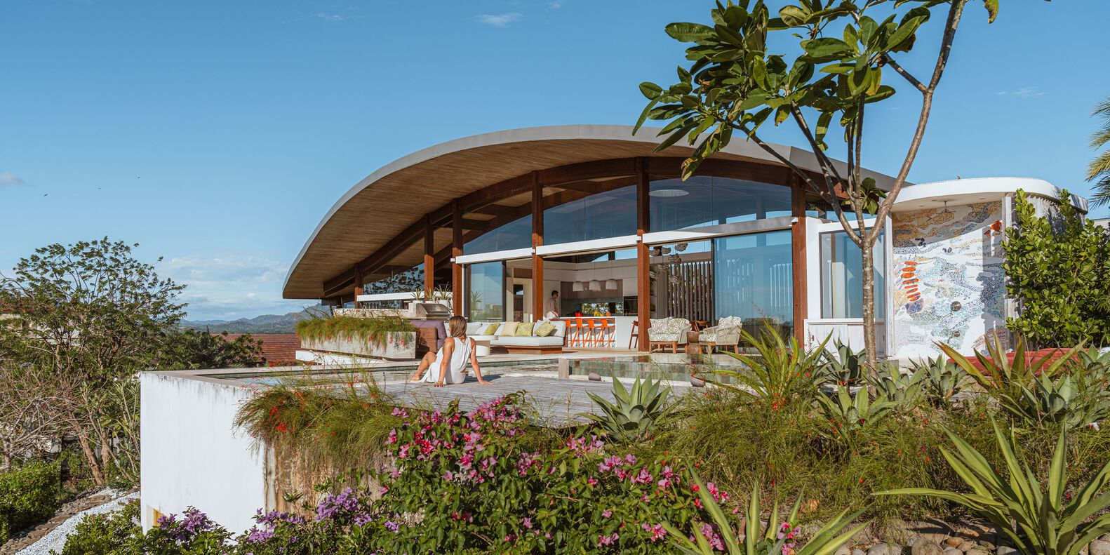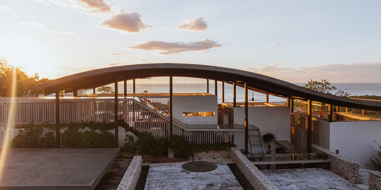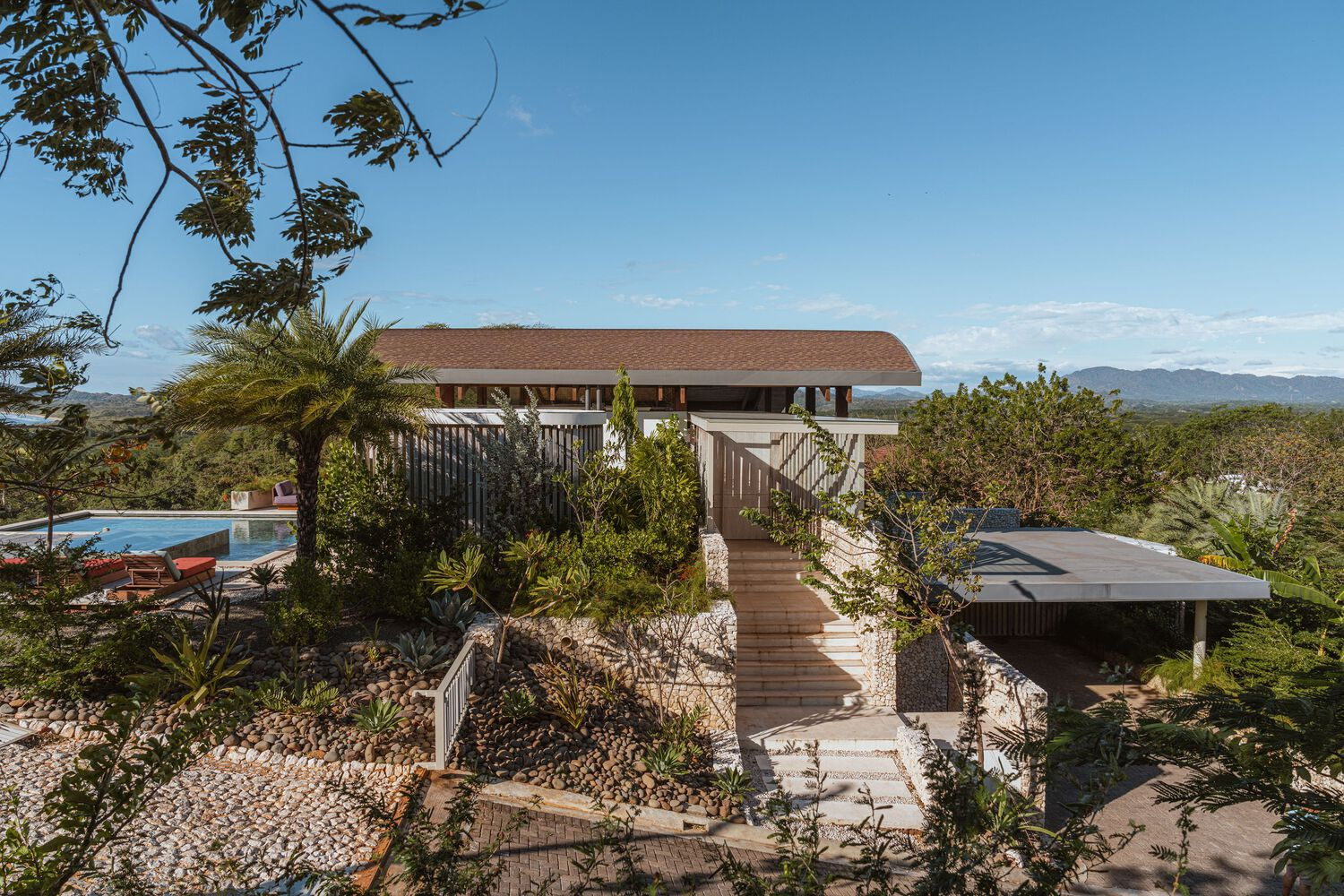 A sweeping, curved roof forms the defining silhouette of the home, acting as a unifying element that connects the various spaces beneath it. This design choice not only provides shelter from the tropical climate but also creates an open-air experience that allows residents to interact with nature seamlessly. Pavilion-like volumes are carefully arranged to allow cross-ventilation, reducing reliance on artificial cooling and fostering a naturally comfortable atmosphere.