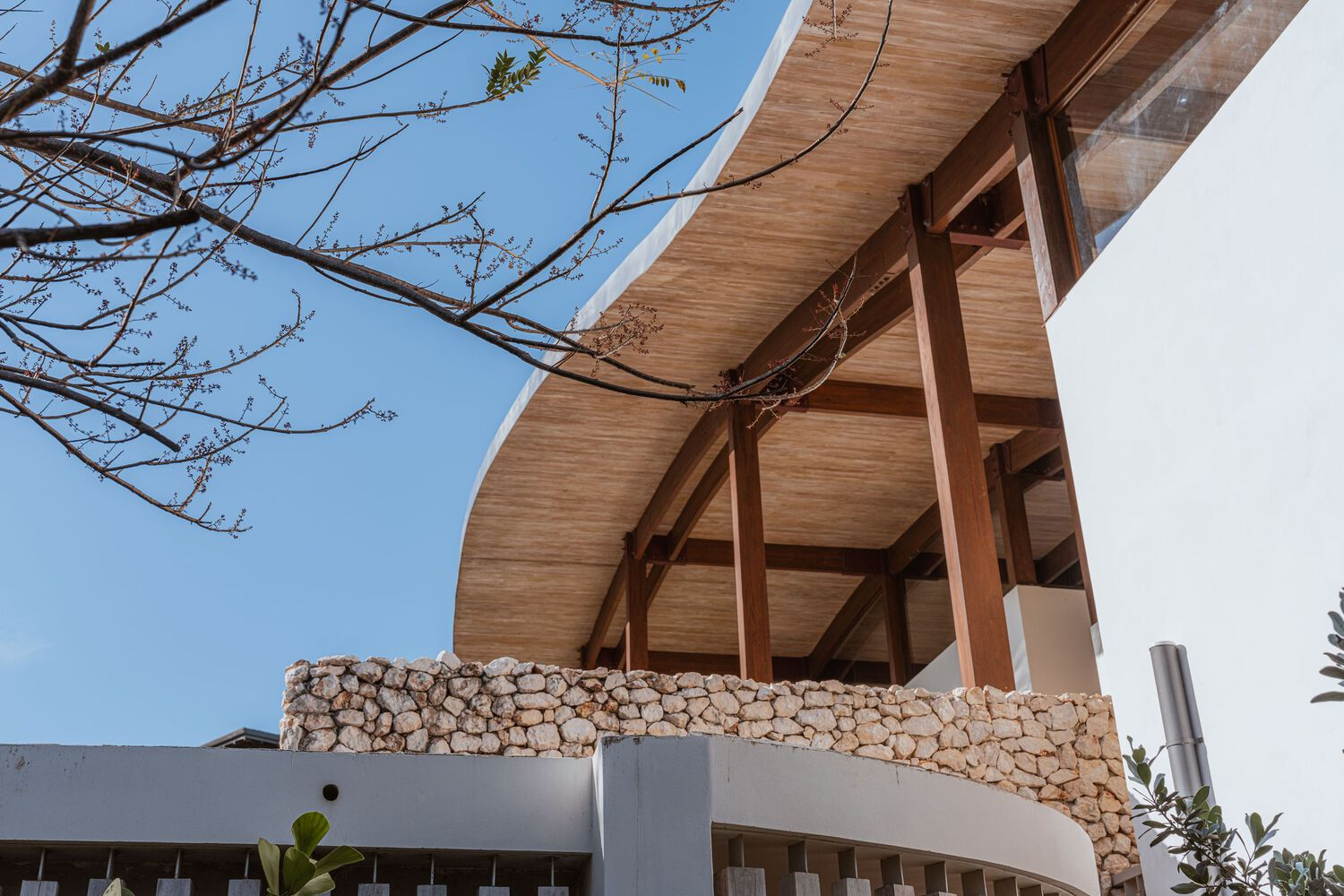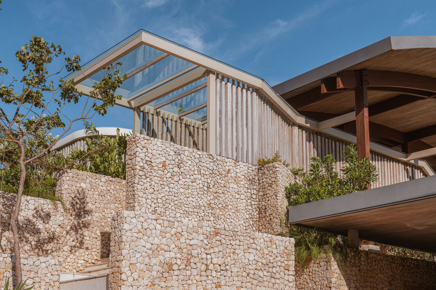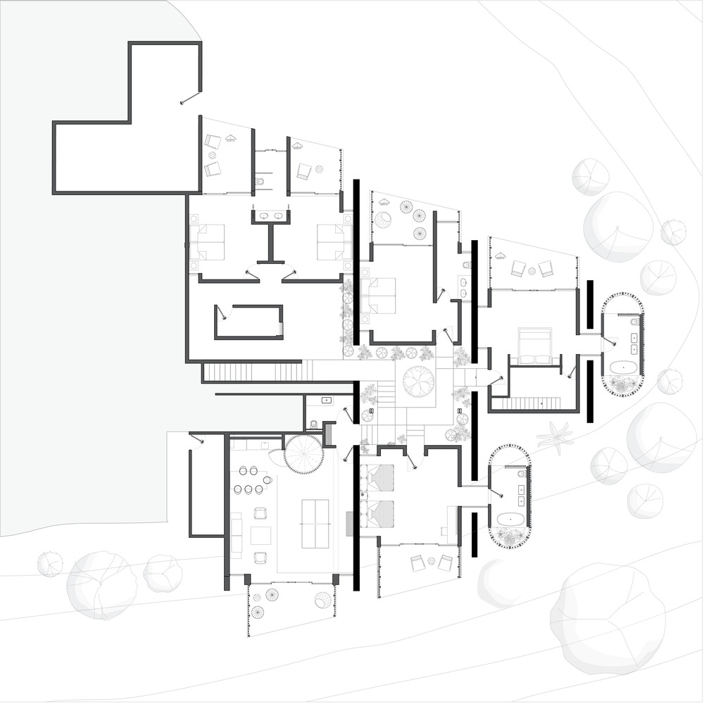 Villa Áurea’s construction methodology embraces the site’s natural characteristics, utilizing the solid rock foundation as a structural advantage. Instead of extensive excavation, Studio Saxe implemented a system of pre-stressed wooden pillars and beams that require minimal intervention in the landscape. These structural components support the organic roof, allowing for a harmonious balance between stability and aesthetic fluidity.