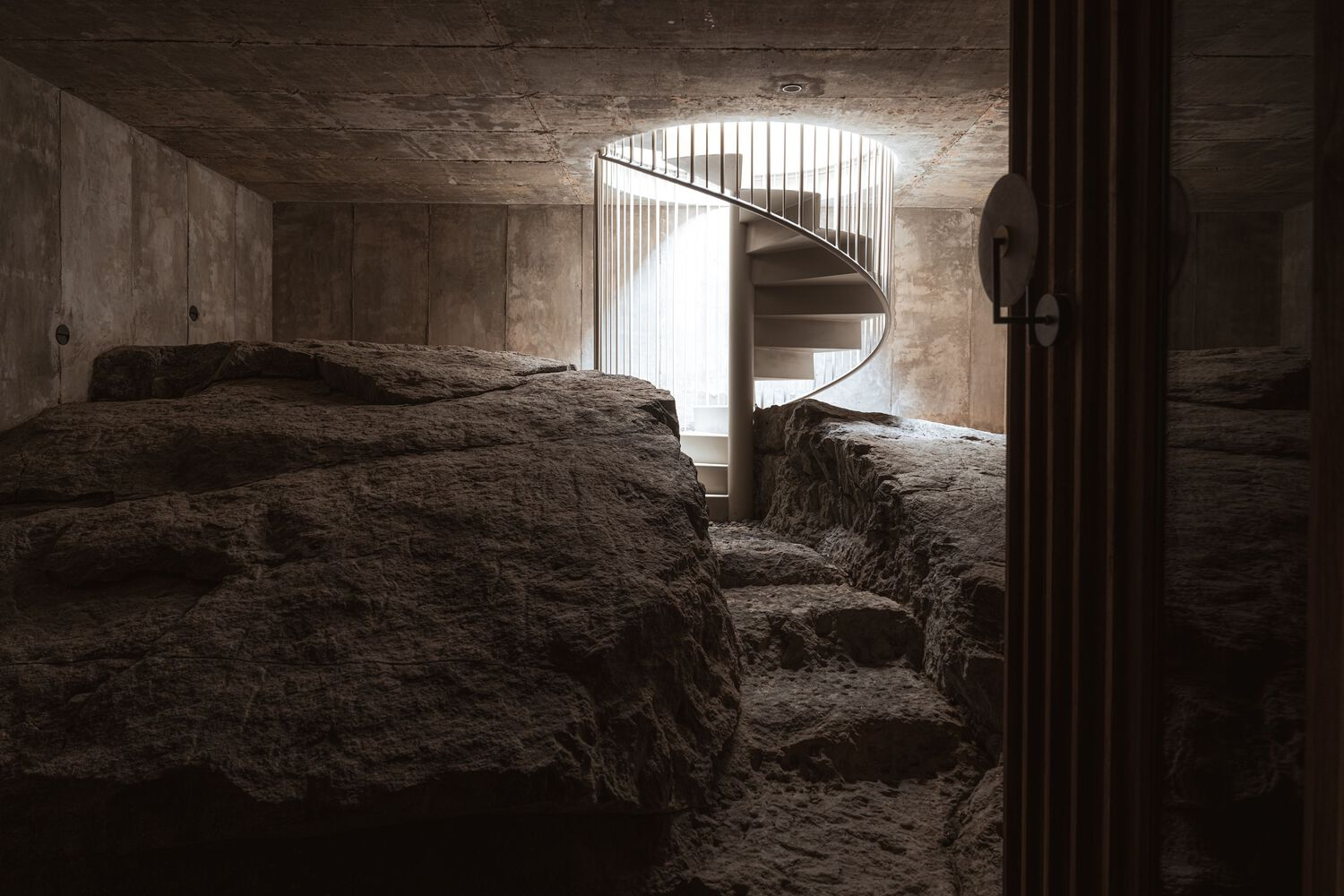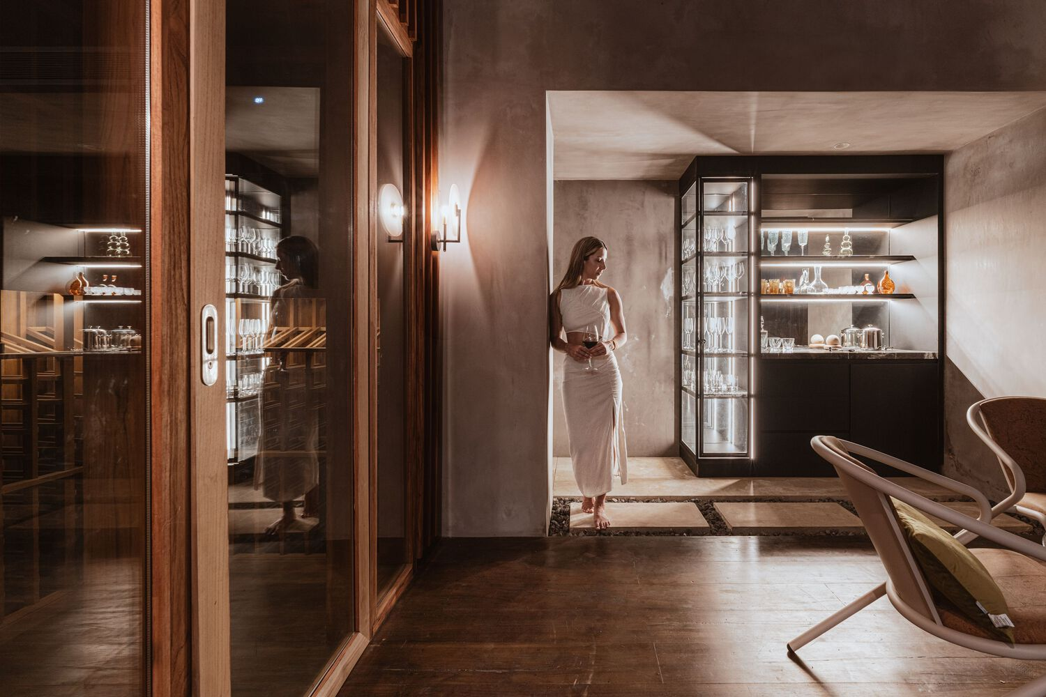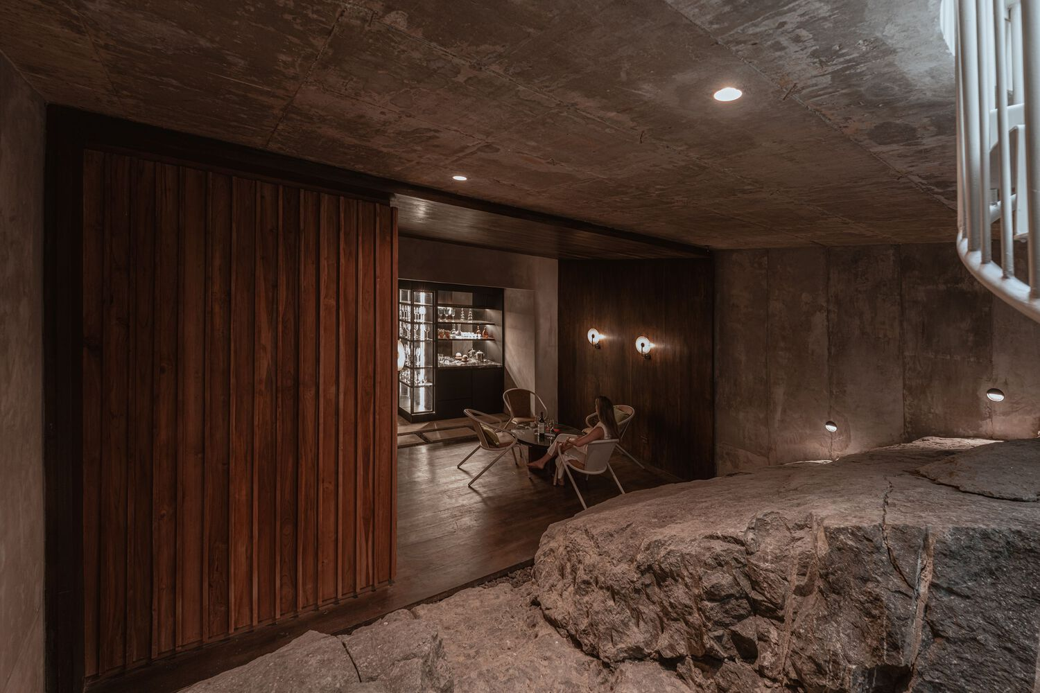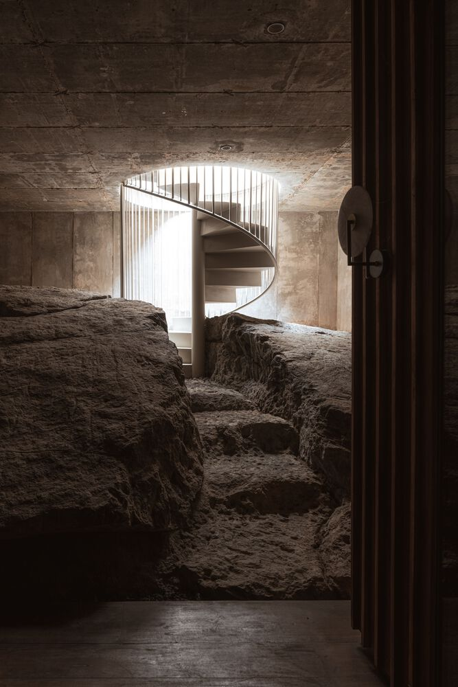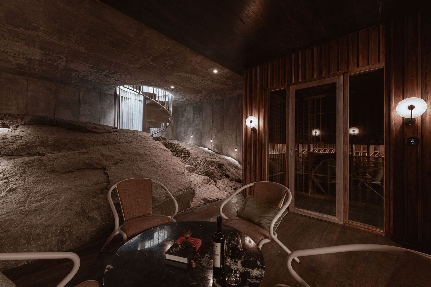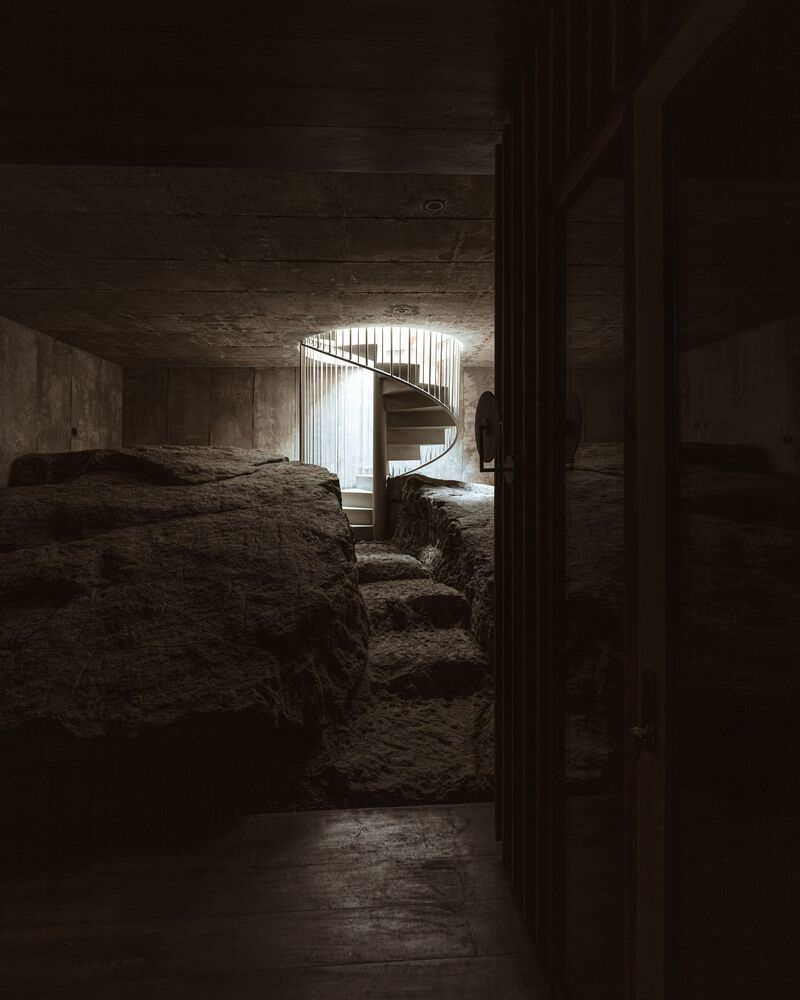 One of the most intriguing discoveries during construction was a large solid stone beneath a workspace. Rather than removing it, the design team embraced it, transforming it into a private wine cellar. This unexpected feature underscores the project’s adaptability, demonstrating how architecture can evolve in response to the land itself.