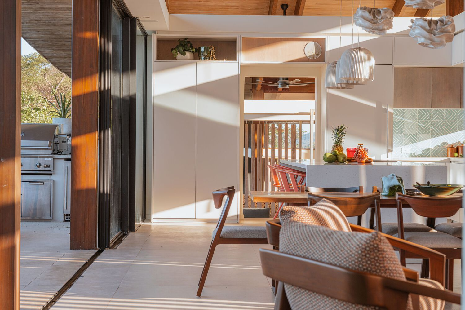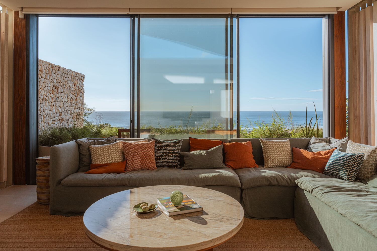 The interiors of Villa Áurea are an extension of its architectural philosophy, prioritizing a deep connection with nature. The design integrates natural materials, handcrafted elements, and organic textures, ensuring that each space feels warm and inviting. Large openings and transitional spaces blur the boundaries between indoors and outdoors, creating a fluid living experience that immerses residents in the surrounding landscape.