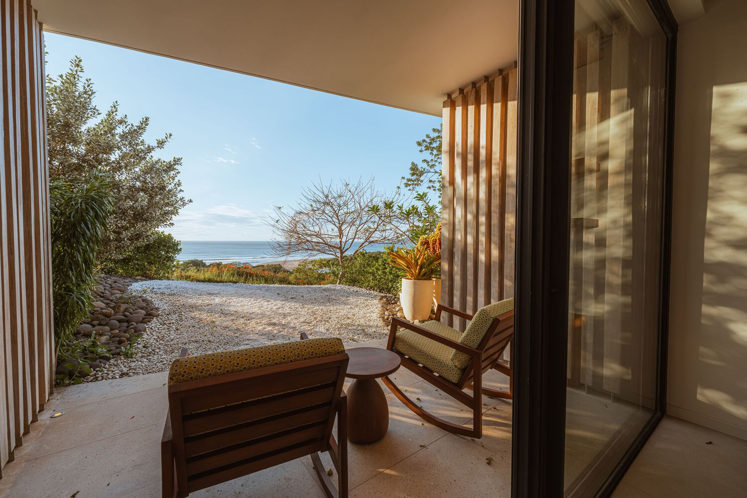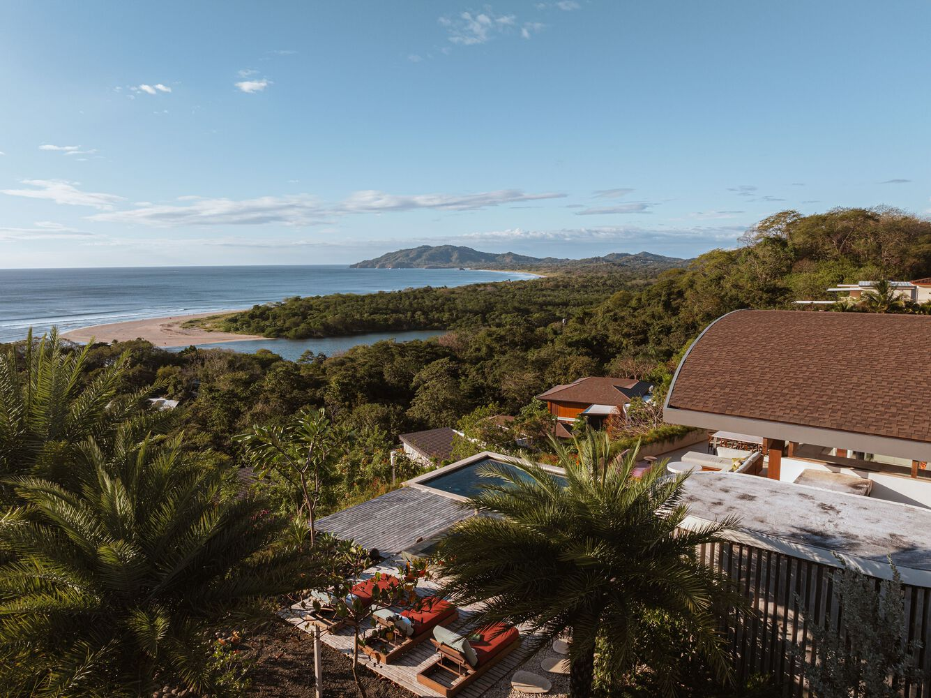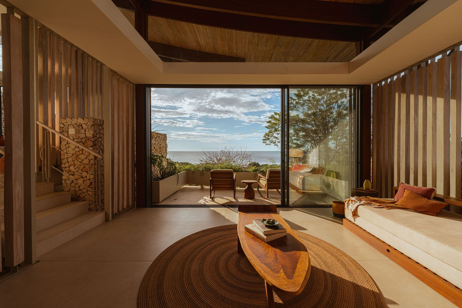 A standout feature of the interior design is the use of custom-made furniture crafted from salvaged Guanacaste and Guapinol trees. The pieces were meticulously designed over two and a half years, highlighting the importance of craftsmanship and sustainability. High-performance European textiles complement these natural elements, ensuring durability while maintaining a refined aesthetic.
