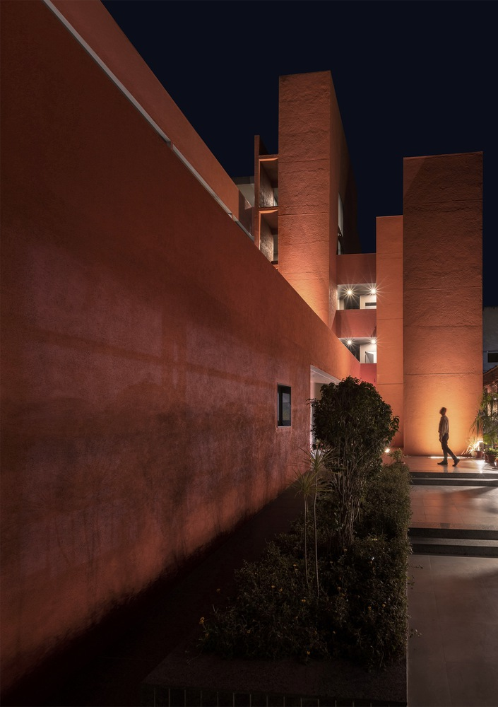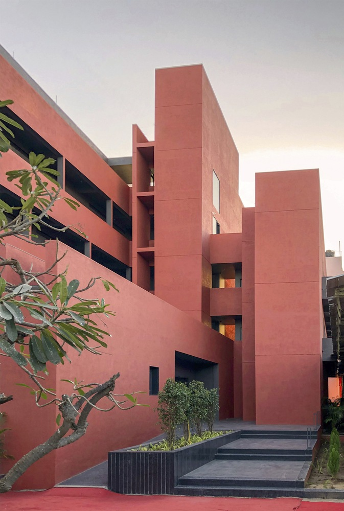 Situated just an hour’s drive from Surat city in Gujarat, the Red Vessel Hotel is a recent addition to a larger resort complex that caters to both recreational and socio-cultural activities. Designed by the architectural firm ROOMOOR, this project encompasses a 2500 m² area and was completed in 2021. It includes an extension to an existing hotel, adding 40 rooms, three dormitories, and conference facilities designed to support a range of events and gatherings.