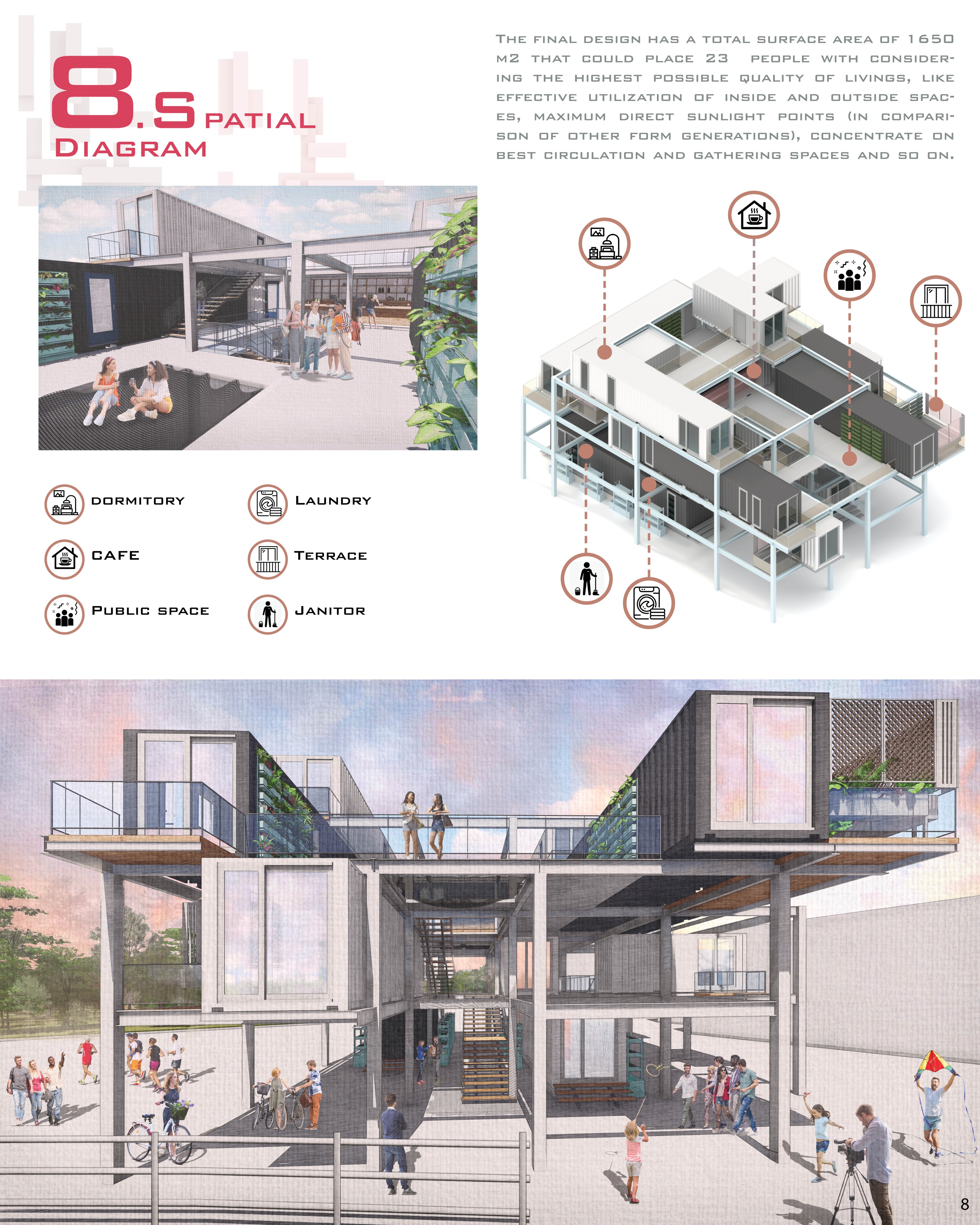 Description: Architecture is an ongoing adaptation to the multiple conflicting forces flowing through society. Our project offers an alternative reality where standardization is utilized to create a costume environment that expresses the students' experience of living abroad. And how architecture intervenes to make it less alien and more enjoyable.