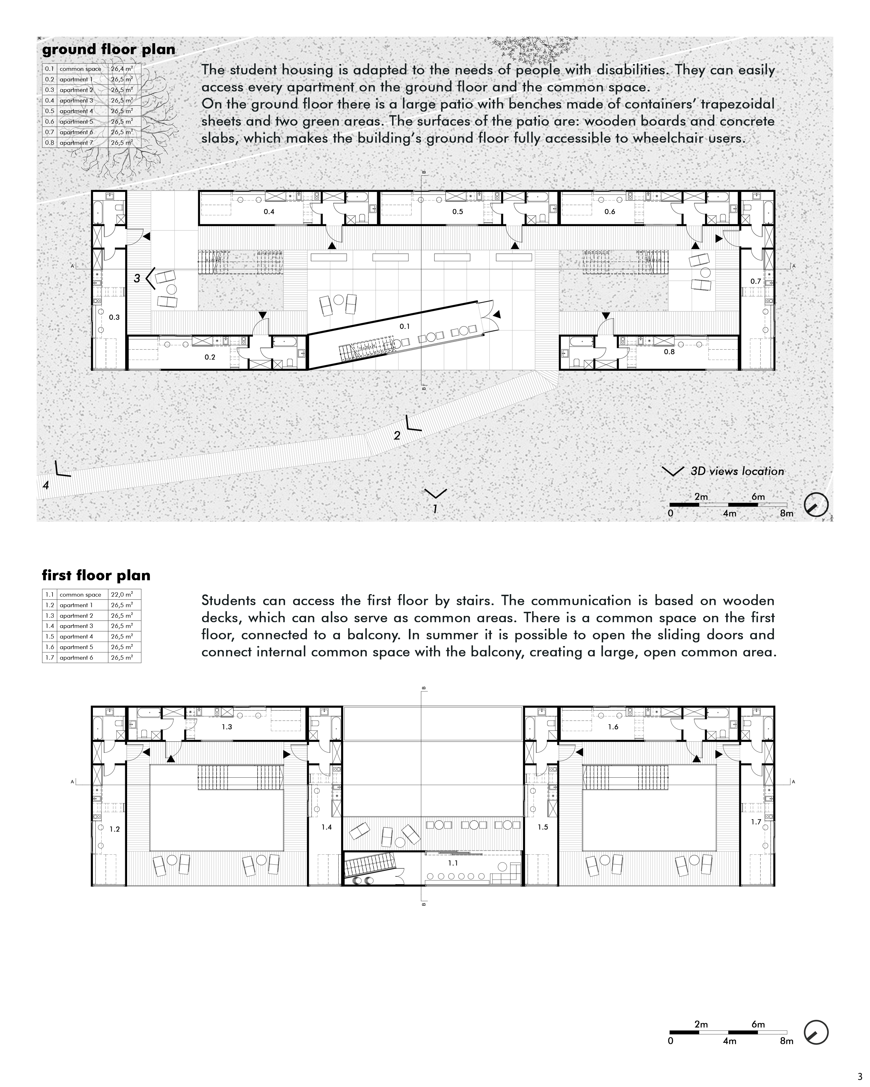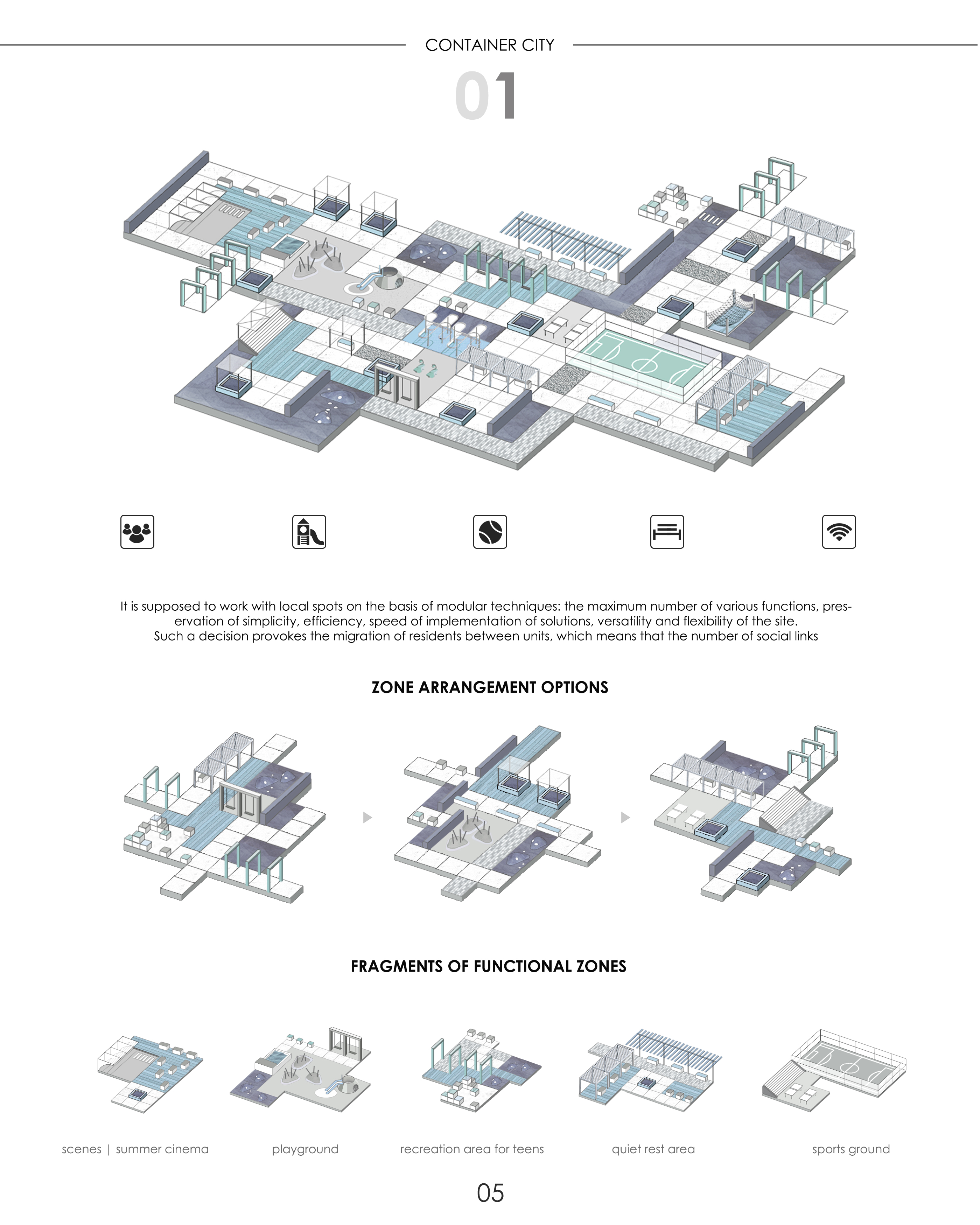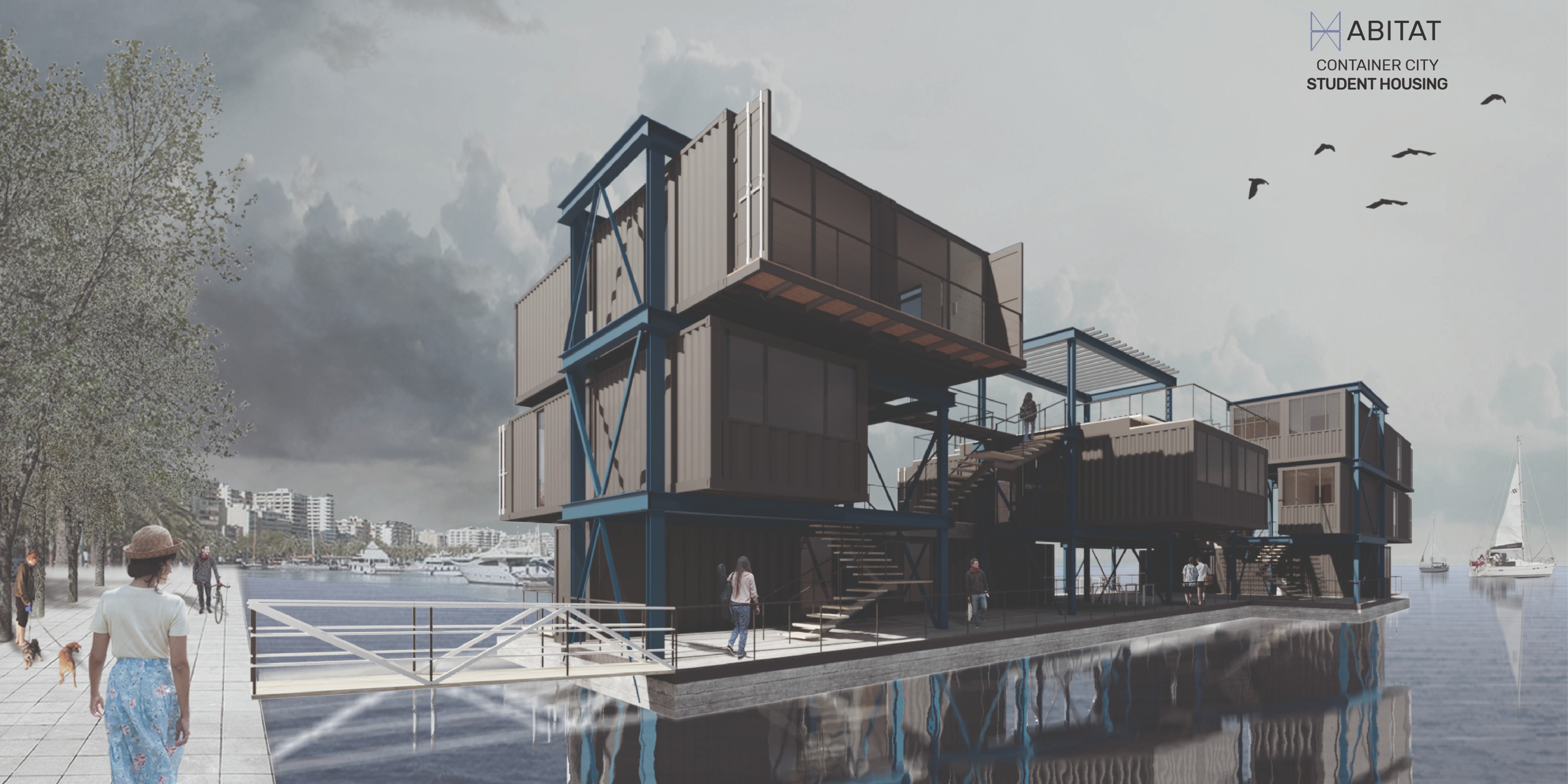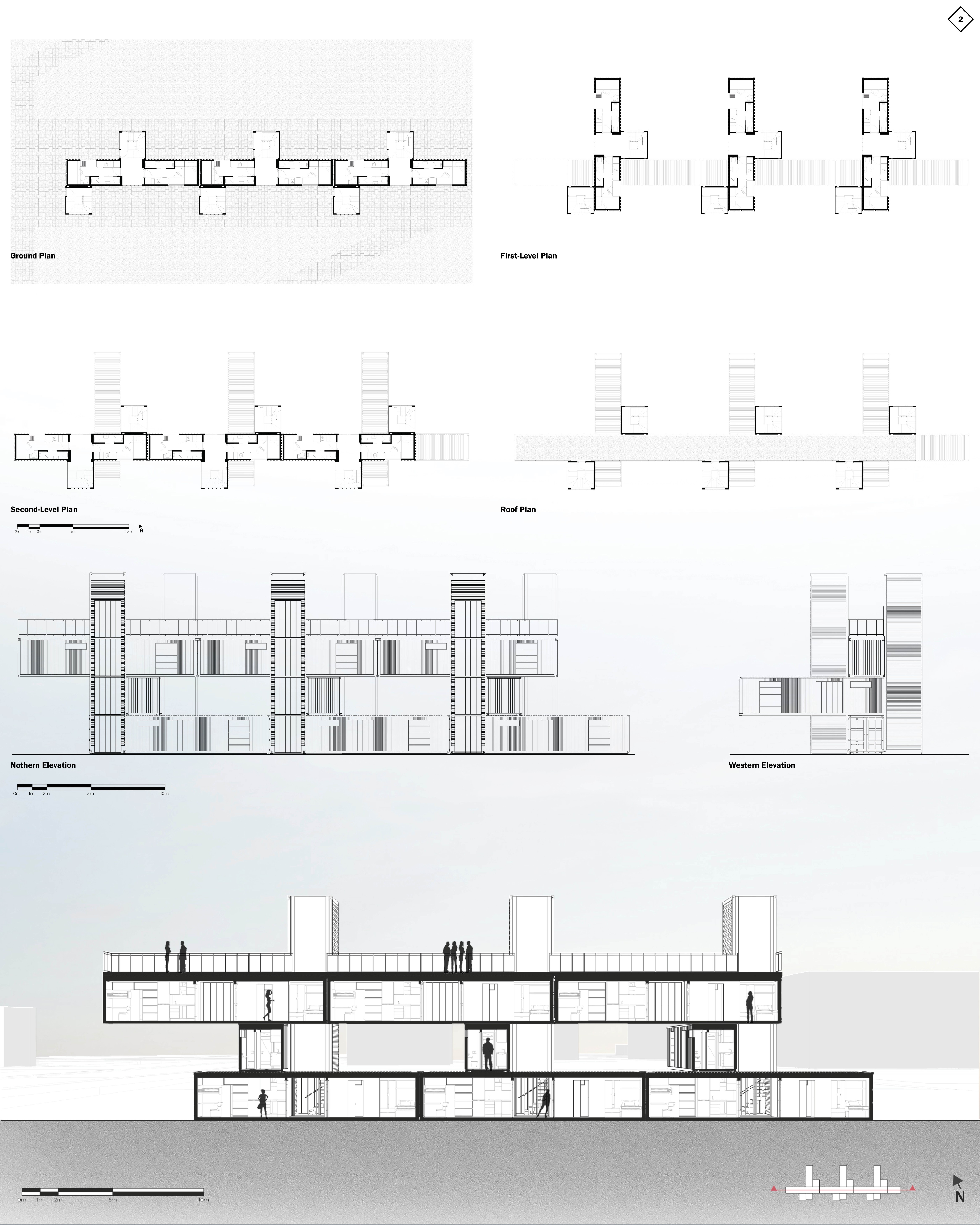 Description: Student accommodation laid out on a structural grid using 15 shipping containers. Designed for city coastal living, and for students who have an interest in water sports activities. The grid can be transported to denser, urban landscapes and expanded through the years.