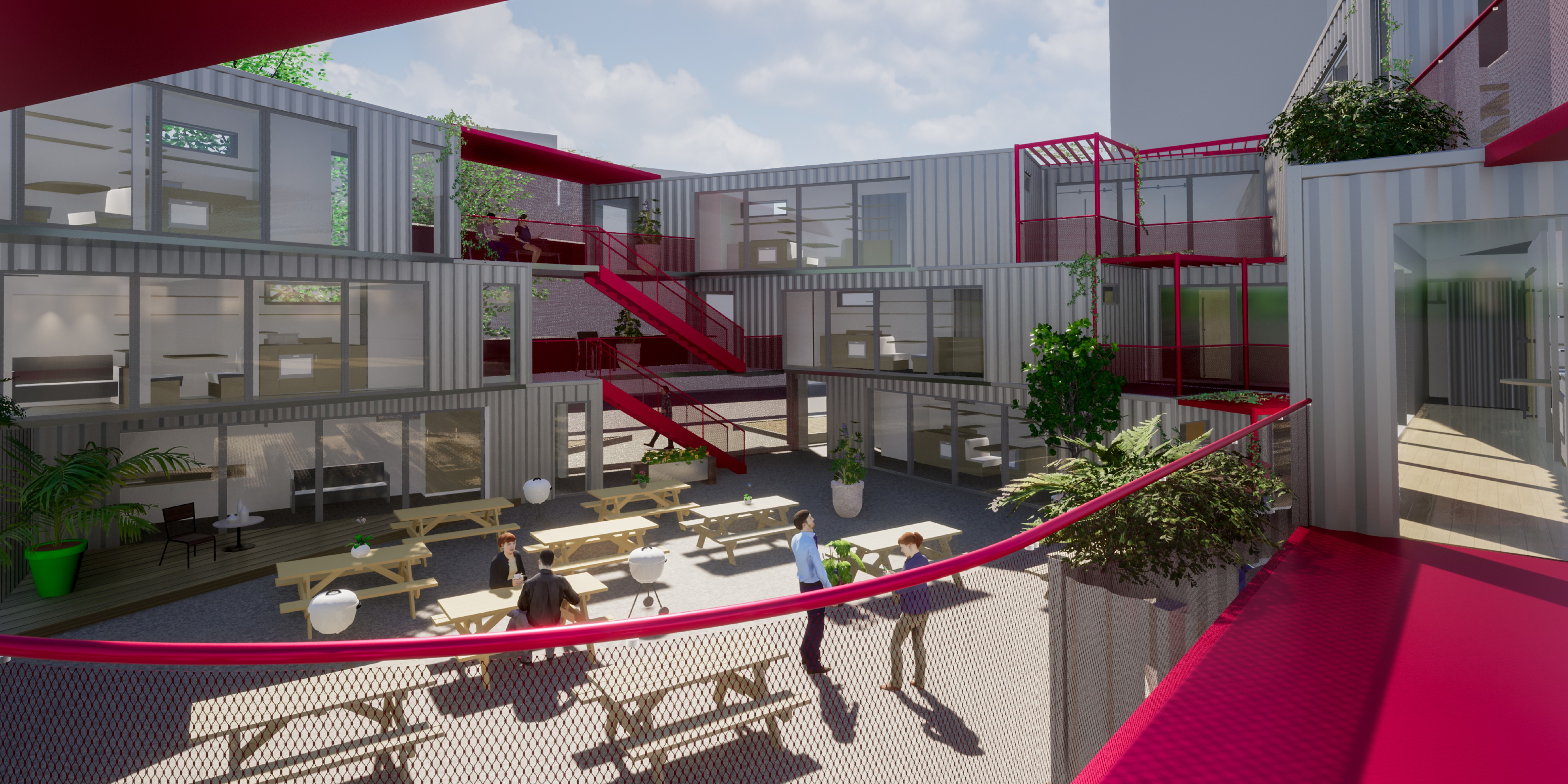 Description: A small community of manufactured & affordable student housing; living closely together in a block of industrial containers