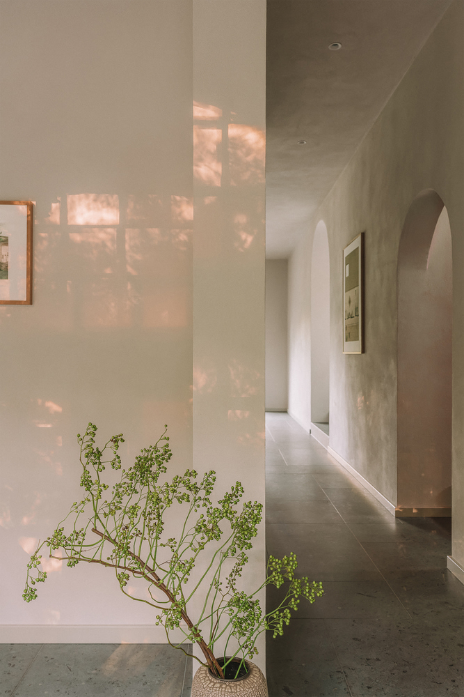 Contrasting the structured exterior, the interior of the duplex is designed to evoke the feeling of a mysterious, sheltering cave. The use of warm, finely textured clay plaster unifies the differently proportioned rooms, creating a cohesive and inviting ambiance. The public areas feature a shimmering green natural stone, extending its elegance to the sanitary facilities and showers, while natural oiled oak parquet graces the private upper rooms, adding a touch of warmth and sophistication.