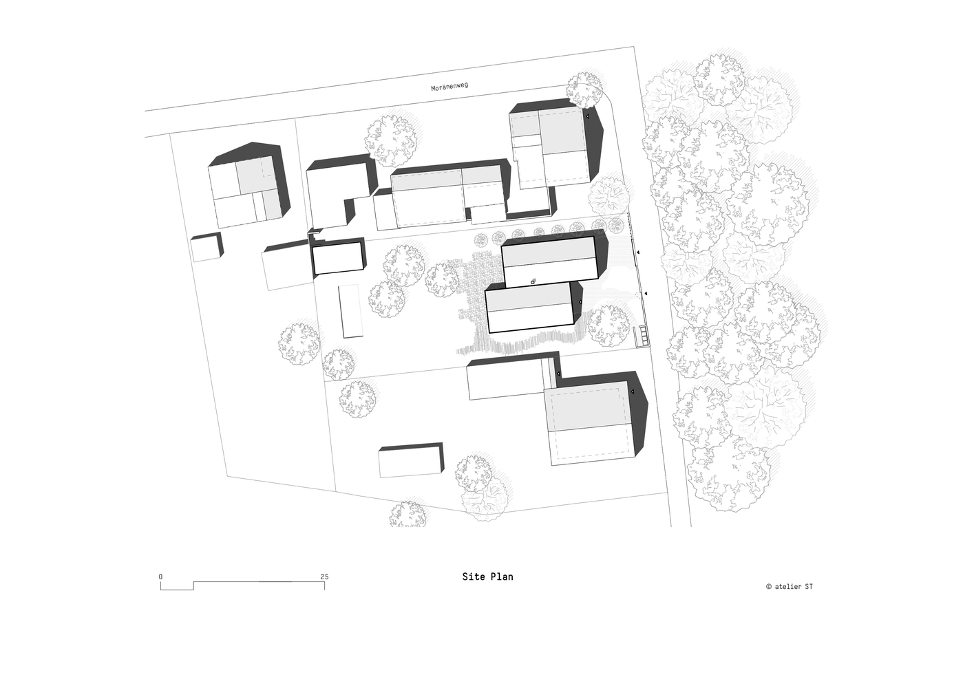 The duplex is strategically positioned to maximize the views of the forest to the east and the orchard to the west. This deliberate orientation fosters a deep connection with the natural environment, allowing residents to enjoy serene vistas and the tranquility of nature from the comfort of their home.