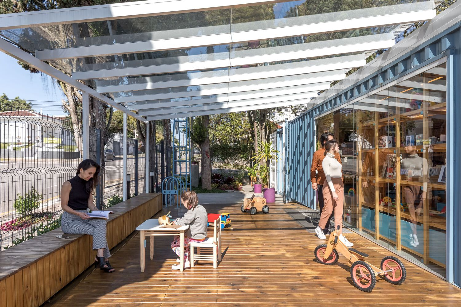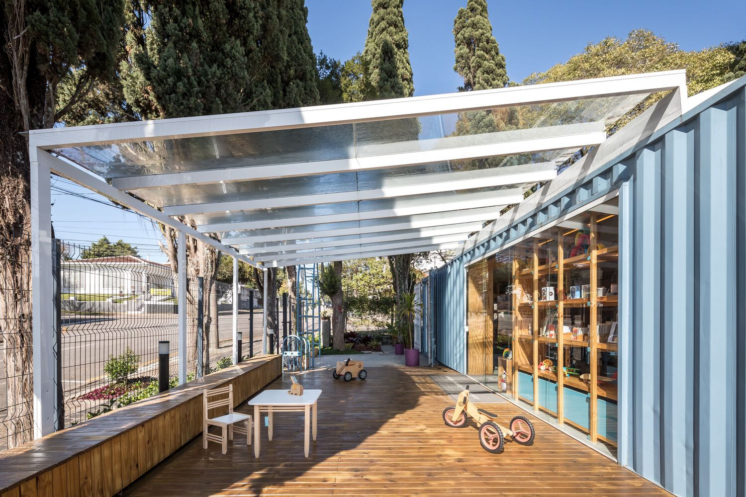 A significant aspect of the Garimpê store expansion is its versatility. The addition of the wooden deck allows the store to host workshops, events, and exhibitions. This open space, surrounded by the store’s natural garden, offers children and families an opportunity to engage with the products in different ways. The ability to host such activities further enhances the store’s role as a hub for creativity and development, blending retail with education.