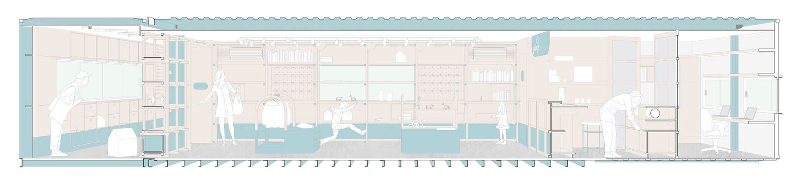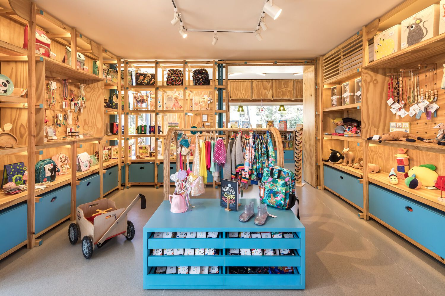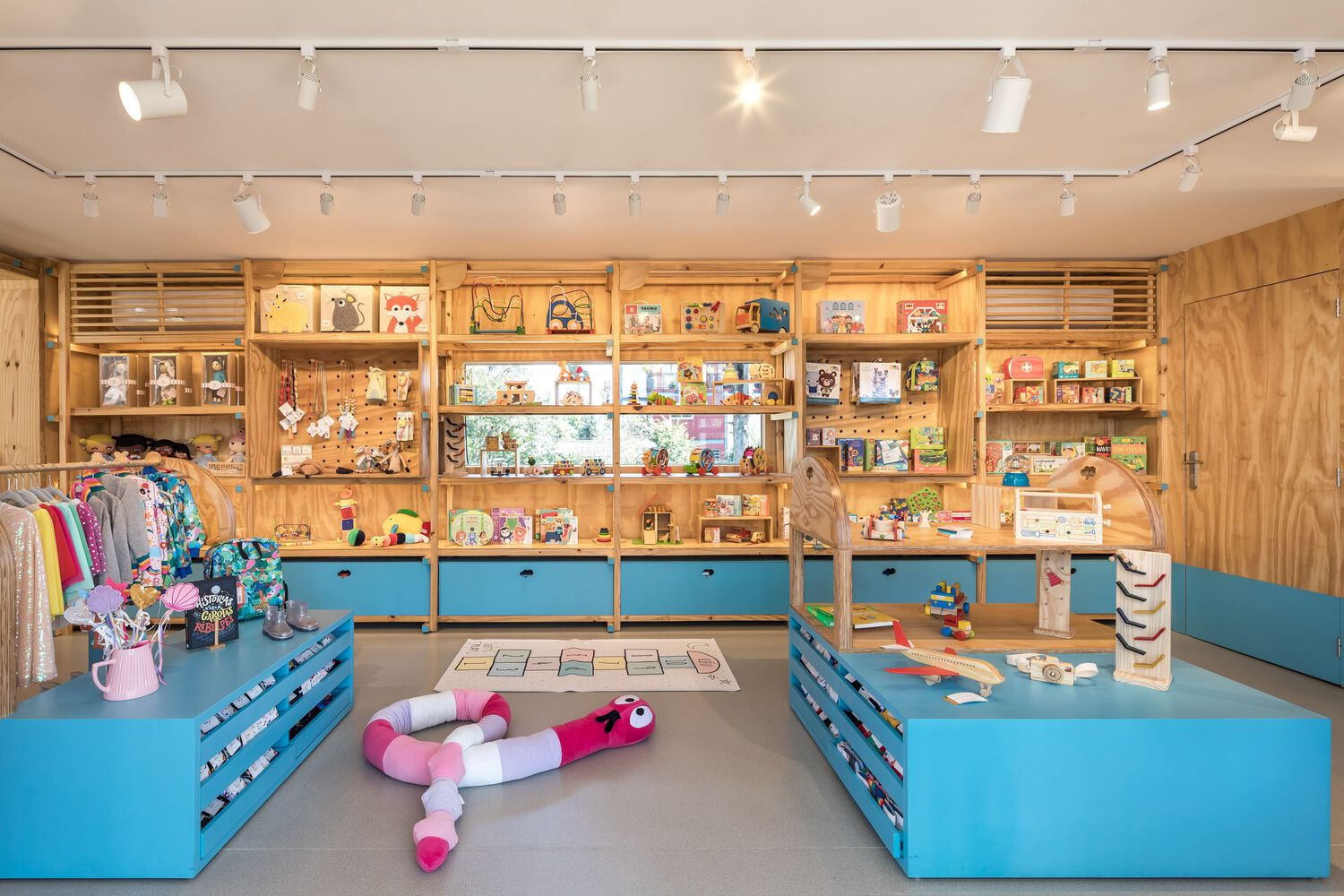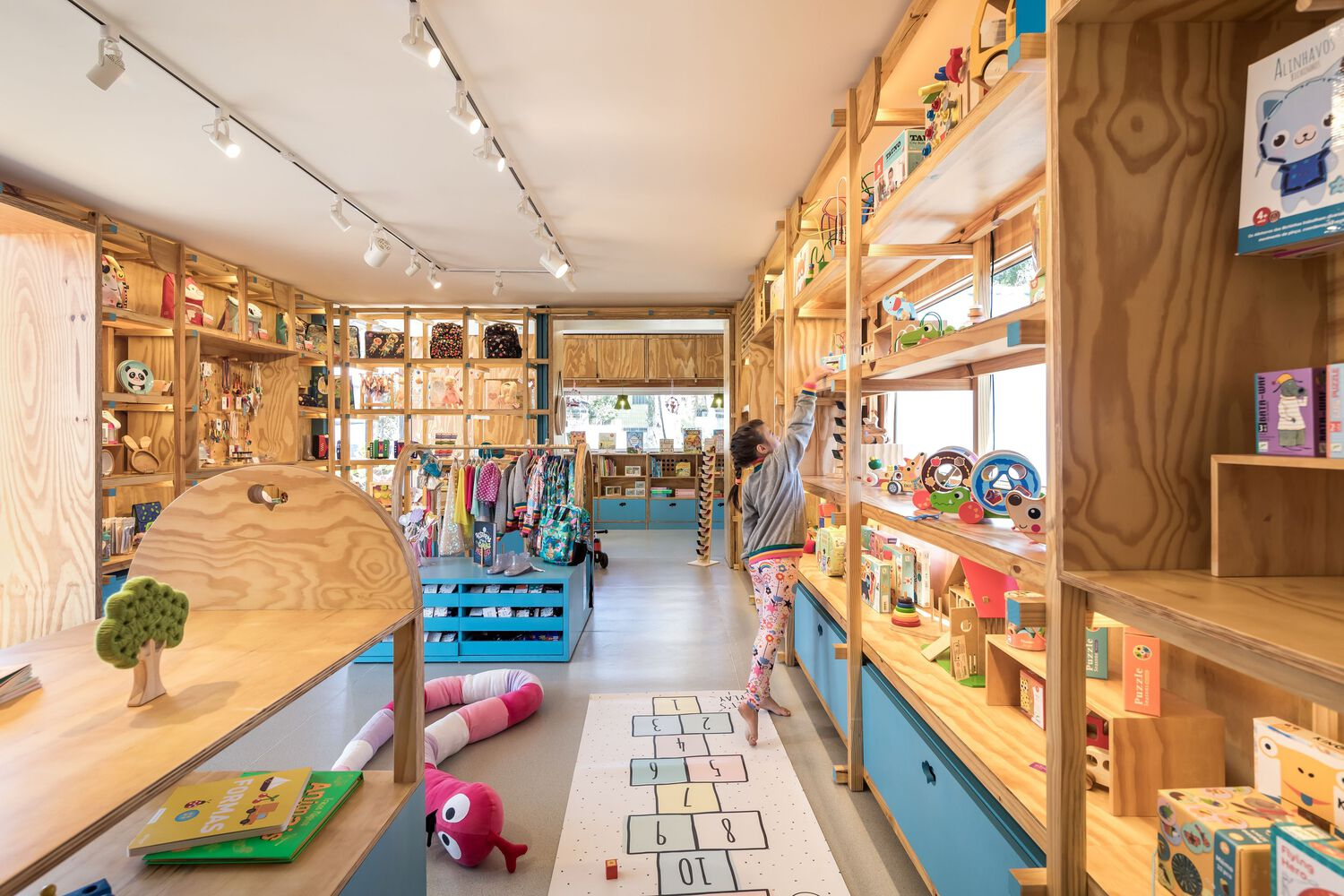 The architects also employed a neutral-toned floor to allow the wood and blue accents to stand out, creating a visually appealing environment that highlights the store’s unique character. This careful material selection demonstrates how contemporary store architecture for children goes beyond just functionality—it creates a sensory experience that encourages creativity and learning.
