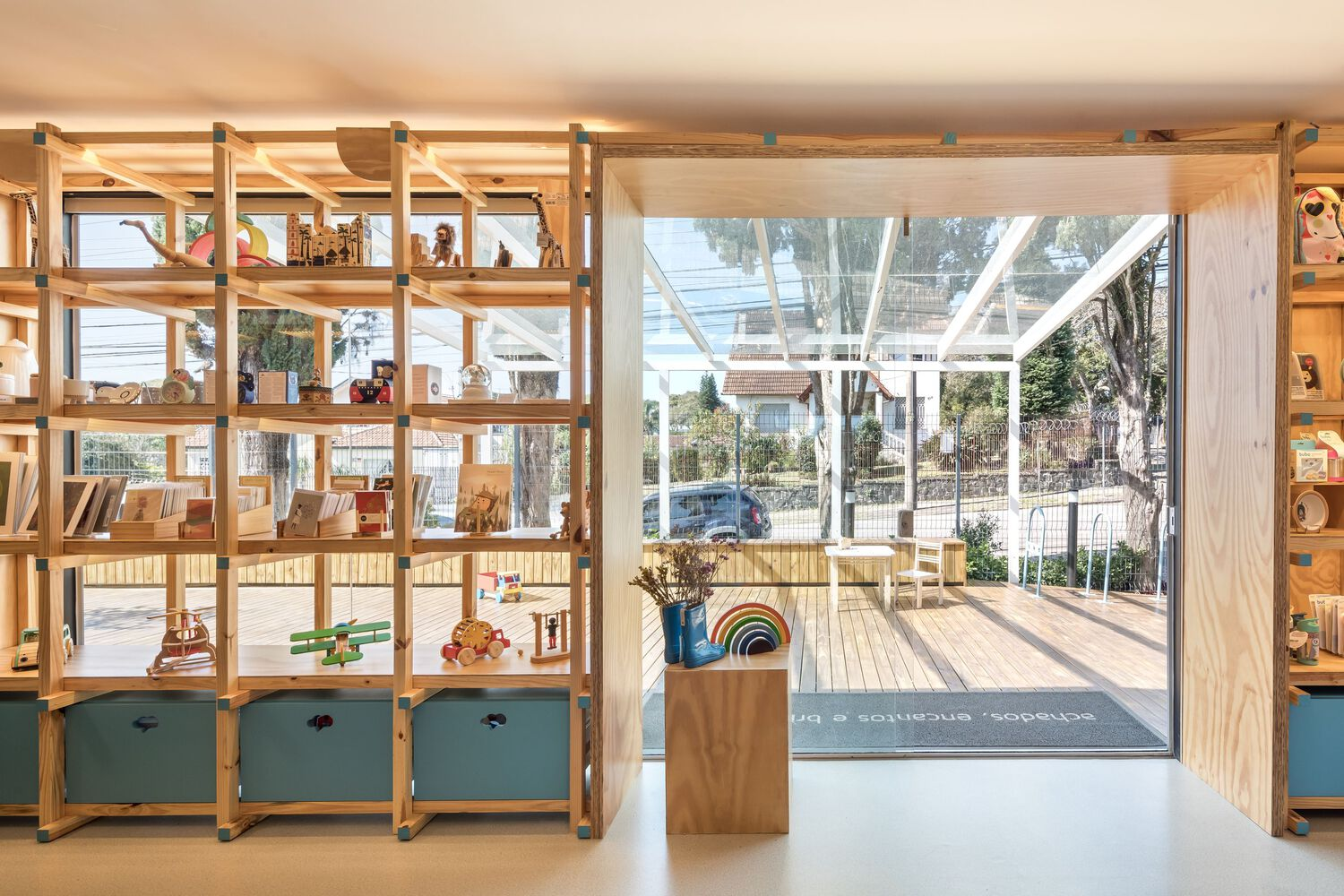 The architects aimed to create a gentle transition between the external environment and the store’s interior. Upon arrival, visitors are greeted by a portal that sets the tone for what lies ahead. The entrance is followed by a wooden deck and a glass roof, which not only provide shelter but also establish a welcoming atmosphere. This thoughtful entrance design highlights the role of child-friendly architecture in creating inviting spaces that feel safe, yet exciting.