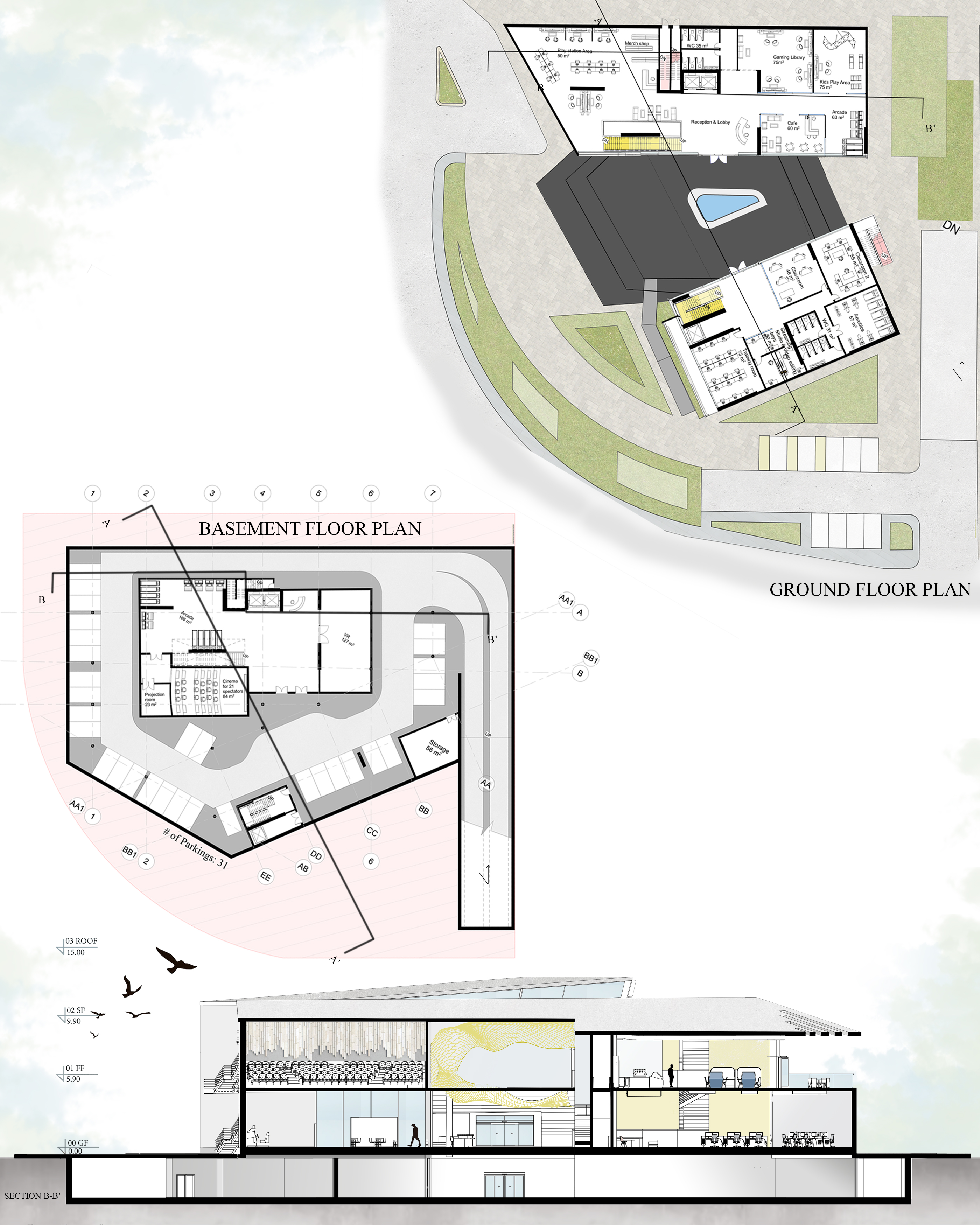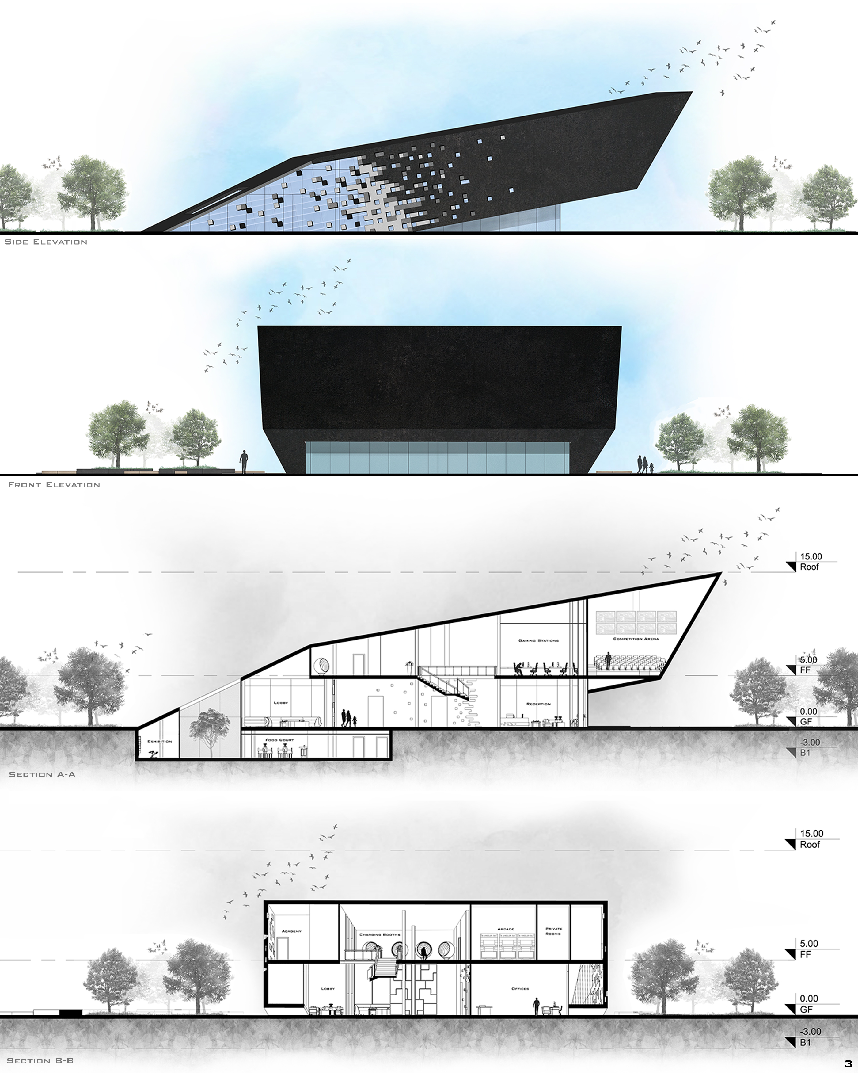 Description: Nowadays the concept of gaming has been completely changed, when we think about gaming we think about the digital and virtual world. A world that is intangible and can’t be physically felt. As a group of youths who enjoy video games and had enough knowledge about this field, we decided to design a building suitable for all kinds of gamers.