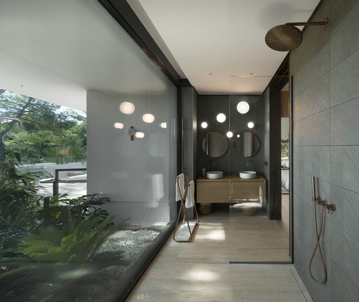 At the heart of the villa lies a large central atrium, home to an exquisite infinity pool. This space acts as a visual and functional hub, linking the various islands while providing a spectacular view from the aromatic entrance garden.