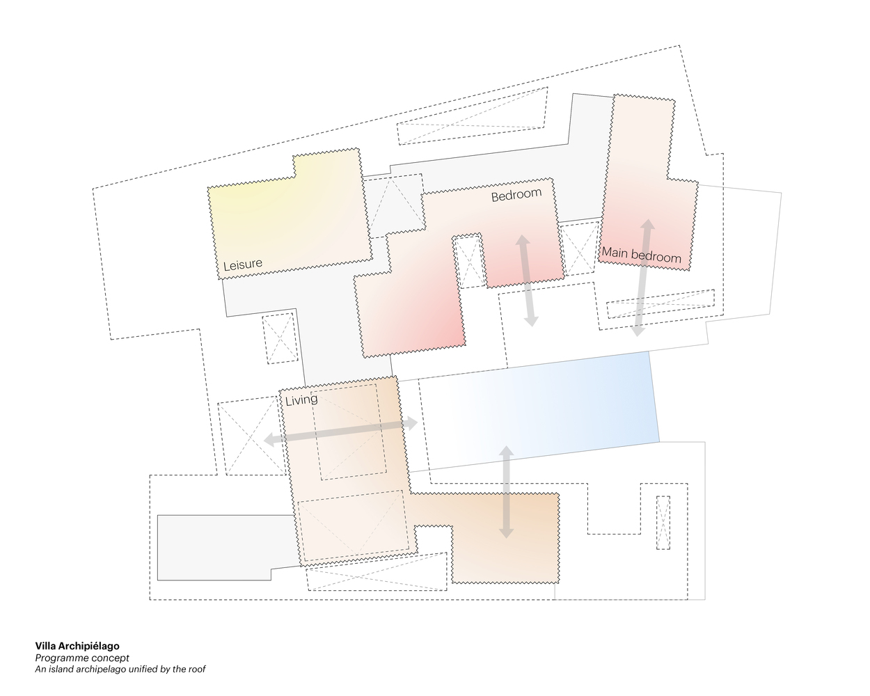 The islands are arranged around a spacious open atrium, surrounded by lush gardens. A large swimming pool dominates this area, complemented by an outdoor kitchen and dining space, creating an ideal setting for family gatherings and entertainment.