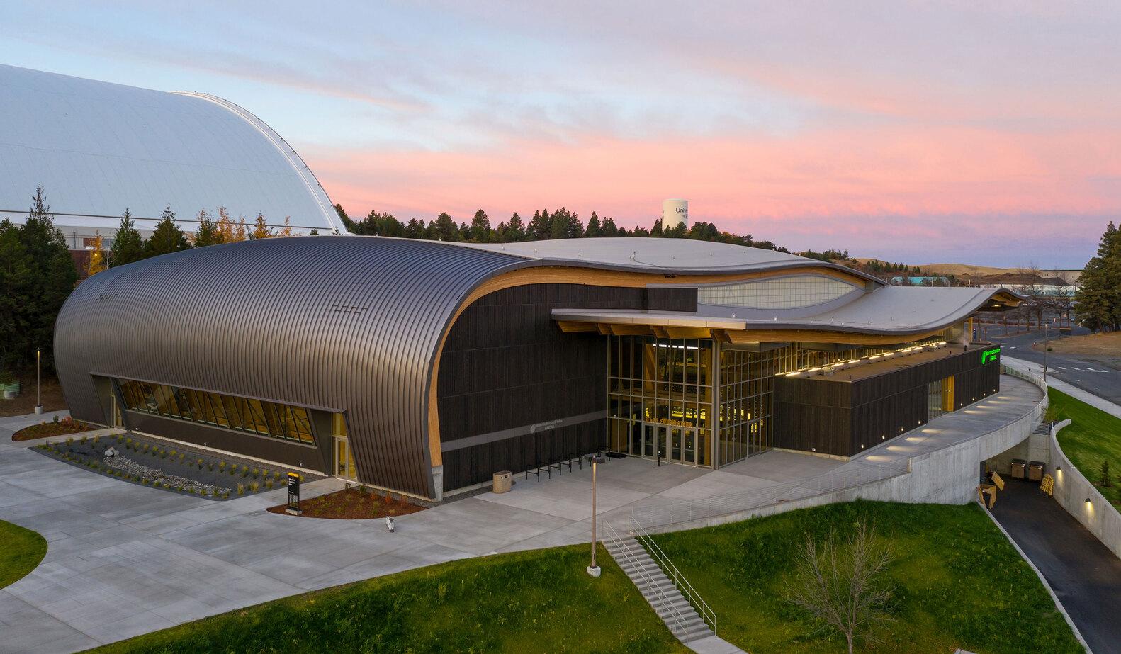 The architectural design of the Idaho Central Credit Union Arena draws inspiration from the undulating forms of the nearby Palouse region, shaped by historic Missoula floods. The overlapping contoured roof forms mimic the rolling hills, blending the structure seamlessly with its environment.