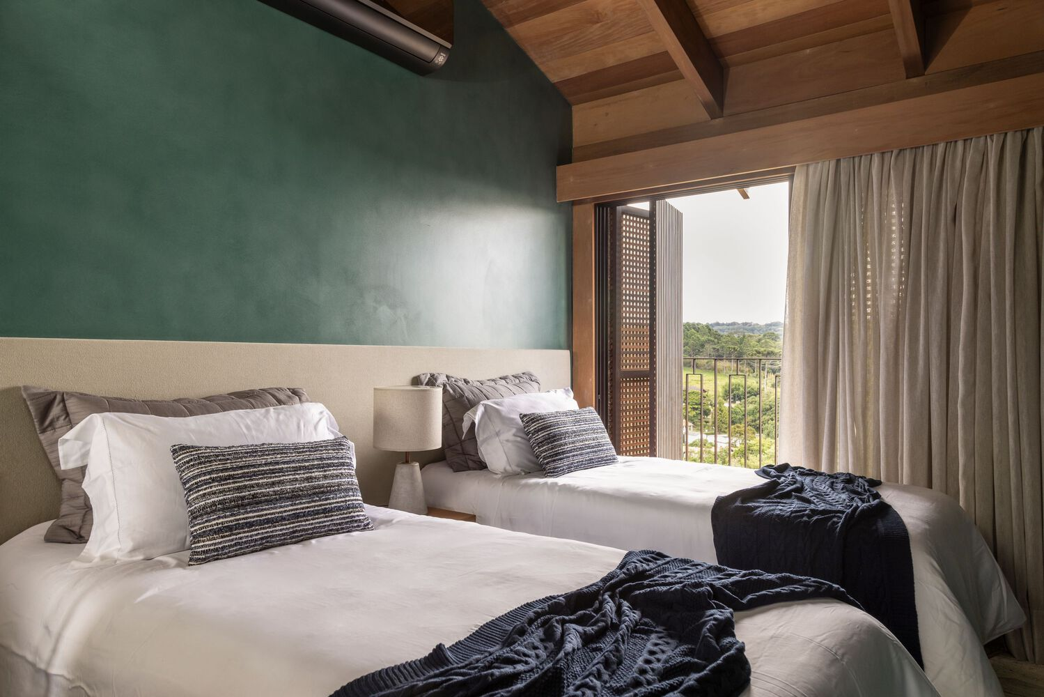 Wooden brises are a standout feature, offering privacy while enhancing the home's aesthetic. These elements play with light and shadow, adding depth and character to the interior spaces.